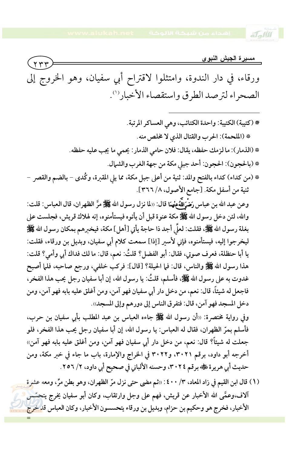 (¬2) روى البخاري عن عروة بن الزبير رَضْيَ اللَّهُ عنْهمَا قال: ((لما سار رسول الله - صلى الله عليه وسلم - عام الفتح، فبلغ ذلك قريشاً، خرج أبو سفيان بن حرب، وحكيم بن حزام، وبُديل بن ورقاء، يلتمسون الخبر عن رسول الله - صلى الله عليه وسلم - فأقبلوا يسيرون، حتى أتوا مرَّ الظهران، فإذا هم بنيران، كأنها نيران عرفة، فقال أبو سفيان: ما هذه؟ لكأنها نيران عرفة، فقال بديل بن ورقاء: نيران بني عمرو، فقال: أبو سفيان: عمرو أقل من ذلك، فرآهم ناس من حرس رسول الله - صلى الله عليه وسلم -، فأدركوهم فأخذوهم، فأتوا بهم رسول الله - صلى الله عليه وسلم -، فأسلم أبو سفيان، فلما سار قال للعباس: احبس أبا سفيان عند خطم الجبل، حتى ينظر إلى المسلمين، فحبسه العباس، فجعلت القبائل تمر مع النبي - صلى الله عليه وسلم -، تمر كتيبة كتيبة على أبي سفيان، فمرت كتيبة، فقال: يا عباس، من هذه؟ قال: هذه غفار، قال: ما لي ولغفار، ثم مرت جهينة، فقال مثل ذلك، ثم مرت سعد بن هذيم، فقال مثل ذلك، ثم مرت سُليم، فقال مثل ذلك، حتى أقبلت كتيبة لم ير مثلها، قال: من هذه؟ قال: هؤلاء الأنصار عليهم سعد بن عبادة معه الراية، فقال سعد بن عبادة: يا أبا سفيان ((اليوم يوم الملحمة، اليوم تستحل الكعبة، فقال أبو سفيان: يا عباس، حبذا يوم الذمار، ثم جاءت كتيبة، وهي أجل الكتائب، فيهم رسول الله - صلى الله عليه وسلم - وأصحابه، وراية النبي - صلى الله عليه وسلم - مع الزبير، فلما مرّ رسول الله - صلى الله عليه وسلم - بأبي سفيان، قال: ألم تعلم ما قال سعد بن عبادة؟ قال: ما قال؟ قال: قال كذا وكذا، فقال: كذب سعد، ولكن هذا يوم يعظّم الله فيه الكعبة، [ويوم تكسى فيه الكعبة] قال: وأمر رسول الله - صلى الله عليه وسلم - أن تركز رايته بالحجون، قال عروة: فأخبرني نافع بن جبير بن مطعم قال: سمعت العباس يقول للزبير [بن العوام]: يا أبا عبد الله، أهاهنا أمرك رسول الله - صلى الله عليه وسلم - أن تركز الراية؟ قال: نعم، قال: وأمر رسول الله - صلى الله عليه وسلم - يومئذ خالد بن الوليد أن يدخل من أعلى مكة من كداء، ودخل النبي - صلى الله عليه وسلم - من كُدى، فقُتل من خيل خالد بن الوليد يومئذ رجلان: حبيش بن الأشعر، وكرز بن جابر الفهري))، [أخرج البخاري في المغازي، باب أين ركز النبي - صلى الله عليه وسلم - الراية يوم الفتح، برقم 4280]، قال الحافظ في (الفتح)، 8/ 10: قوله: وأمر رسول الله - صلى الله عليه وسلم - يومئذ خالد بن الوليد أن يدخل من أعلى مكة من كداء، أي: بالمد، ودخل النبي - صلى الله عليه وسلم - من كُدى، أي: بالقصر، قال الحافظ: وهذا مخالف للأحاديث الصحيحة الآتية أن خالداً دخل من أسفل مكة، والنبي - صلى الله عليه وسلم - من أعلاها، وكذا جزم ابن إسحاق أن خالداً دخل من أسفل مكة، ودخل النبي - صلى الله عليه وسلم - من أعلاها، وضربت له هناك قبة، وقد ساق ذلك موسى بن عقبة سياقاً واضحاً، فقال: وبعث رسول الله - صلى الله عليه وسلم - الزبير بن العوام على المهاجرين وخيلهم، وأمره أن يدخل من كداء من أعلى مكة، وأمره أن يغرز رايته بالحجون، ولا يبرح حتى يأتيه، وبعث خالد بن الوليد في قبائل قضاعة وسليم وغيره وأمره أن يدخل من أسفل مكة، وأن يغرز رايته أدنى البيوت، وبعث سعد بن عبادة في كتيبة الأنصار في مقدمة رسول الله - صلى الله عليه وسلم - وأمرهم أن يكفوا أيديهم، ولا يقاتلوا إلا من قاتلهم. [وقد جاءت الأحاديث الصحيحة الكثيرة أن النبي - صلى الله عليه وسلم - دخل يوم فتح مكة من أعلاها من كداء، انظر: البخاري، برقم 4290، و1575، و1577 - 1581، ومسلم، برقم 1257 - 1260].