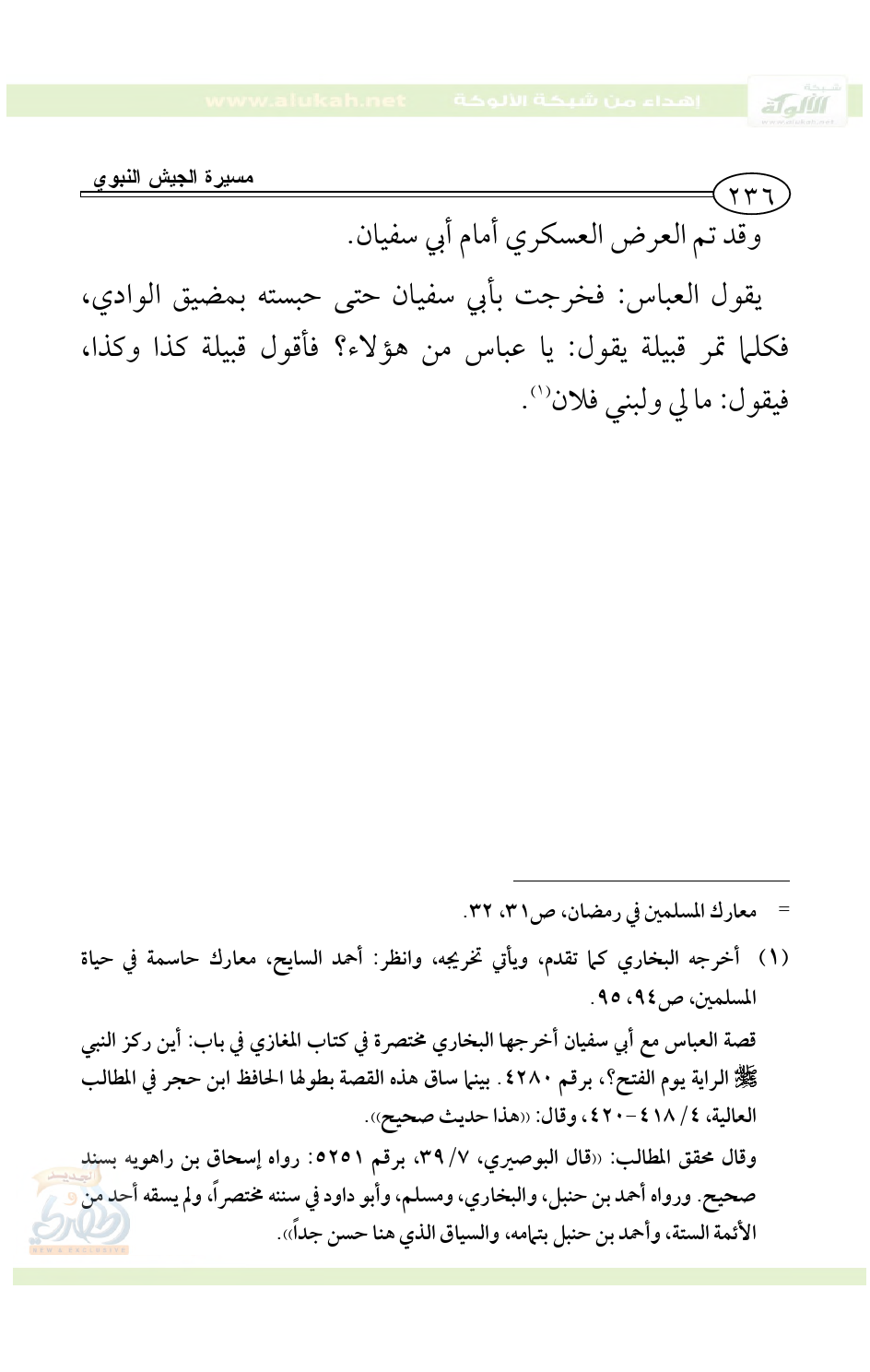 (¬2) عن هشام عن أبيه قال: لمّا سار رسول الله - صلى الله عليه وسلم - عام الفتح فبلغ ذلك قريشاً، خرج أبو سفيان بن حرب، وحكيم بن حزام، وبديل بن ورقاء يلتمسون الخبر عن رسول الله - صلى الله عليه وسلم - فأقبلوا يسيرون حتى أتوا مرَّ الظهران، فإذا هم بنيران كأنها نيران عرفة. فقال: أبو سفيان: ما هذه؟ لكأنها نيران عرفة. فقال بديل بن ورقاء: نيران بني عمرو. فقال أبو سفيان: عمرو أقل من ذلك .. الخ. أخرجه البخاري في كتاب المغازي، باب أين ركز النبي - صلى الله عليه وسلم - الراية يوم الفتح؟، برقم 4280.