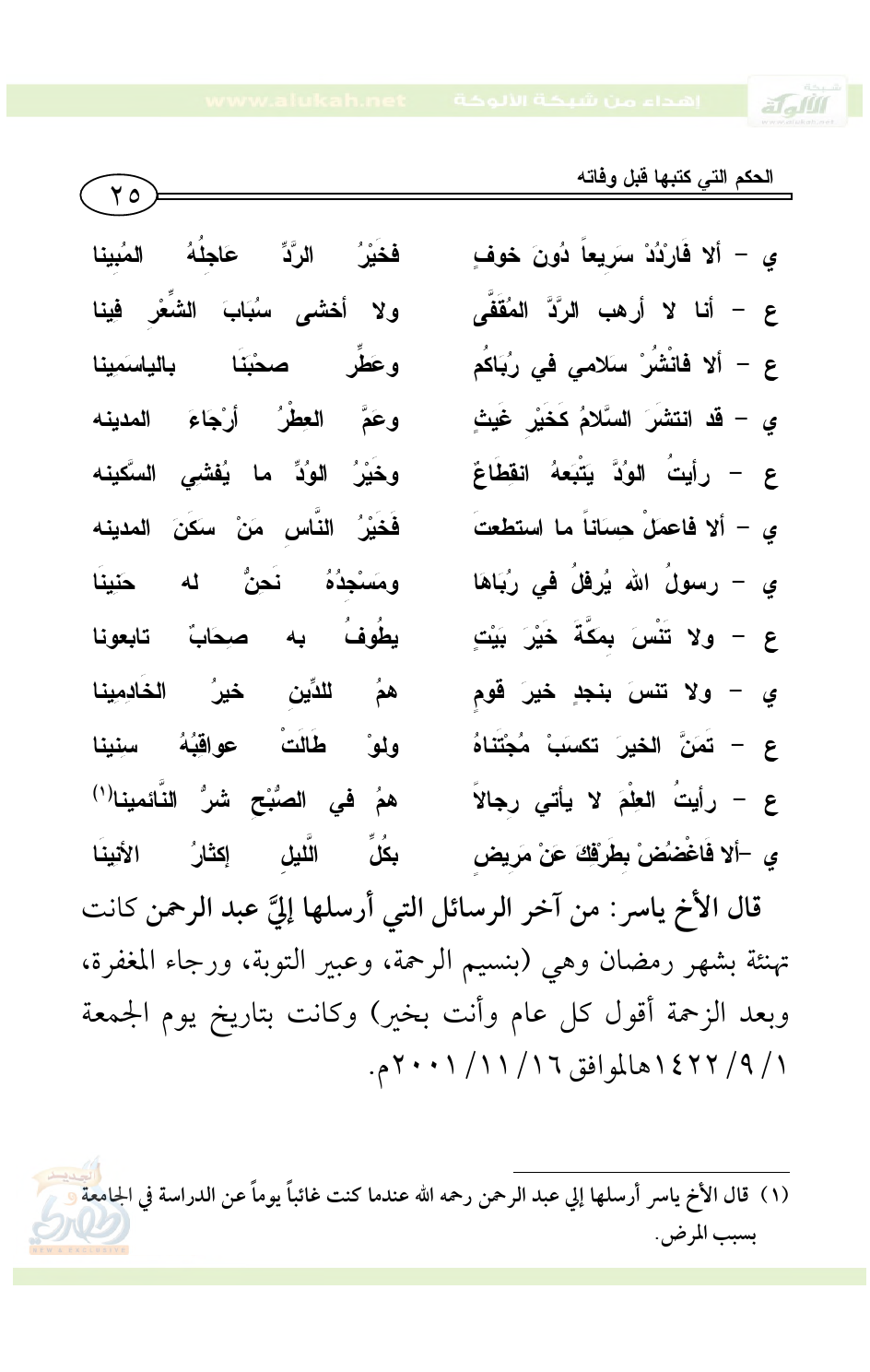 (¬1) قال الأخ ياسر أرسلها إلي عبد الرحمن رحمه الله عندما كنت غائباً يوماً عن الدراسة في الجامعة بسبب المرض.