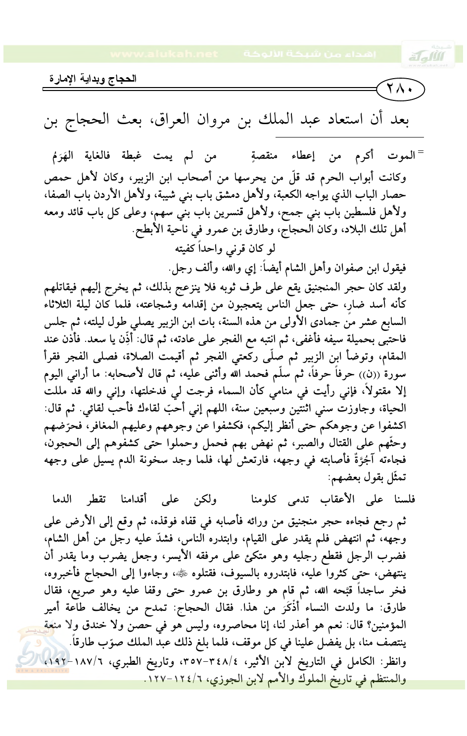(¬2) قال ابن عساكر في تاريخه، 12/ 117: أخبرتنا أم البهاء فاطمة بنت محمد، قالت: أنبأنا أبو طاهر ابن محمود الثقفي، نبأنا أبو بكر ابن المقرئ، أنبأنا أبو الطيّب الزَّرَّاد، نبأنا عبيد الله بن سعد قال: قال أبي: ودخل عبد الملك الكوفة، وبعث الحجاج بن يوسف إلى عبد الله بن الزبير، ورجع عبد الملك إلى دمشق، فحج الحجاج على الموسم سنة اثنتين وسبعين فلم يطف بالبيت، وحصر ابن الزبير قريباً من سبعة أشهر، انتهى.