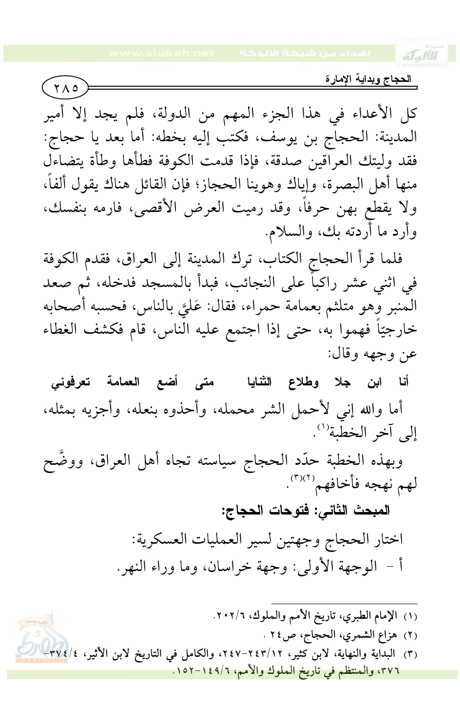 (¬1) قال ابن جرير الطبري في تاريخه، 6/ 202: ((وفي هذه السنة (أي سنة 75هـ) ولّى عبد الملك الحجاج بن يوسف العراق دون خراسان وسجستان، وفيها قدم الحجاج الكوفة، فحدثني أبو زيد قال: حدثني محمد بن يحيى أبو غسان، عن عبد الله بن أبي عبيدة بن محمد بن عمار بن ياسر قال: خرج الحجاج بن يوسف من المدينة حين أتاه كتاب عبد الملك بن مروان بولاية العراق بعد وفاة بشر بن مروان في اثني عشر راكباً على النجائب حتى دخل الكوفة حين انتشر النهار فجاءة، وقد كان بشر بعث المهلب إلى الحرورية، فبدأ بالمسجد فدخله، ثم صعد المنبر وهو متلثم بعمامة خز حمراء، فقال: عليّ بالناس، فحبسوه وأصحابه خارجه، فهمّوا به حتى إذا اجتمع إليه الناس قام فكشف عن وجهه، وقال: