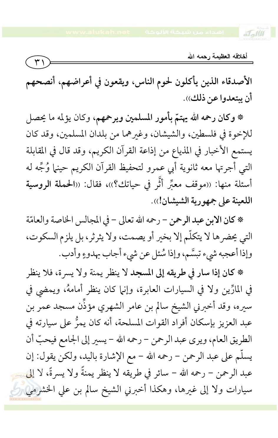 * كان الابن عبد الرحمن - رحمه الله تعالى - في المجالس الخاصة والعامّة التي يحضرها لا يتكلّم إلا بخير أو يصمت، ولا يثرثر، بل يلزم السكوت، وإذا أعجبه شيء تبسَّم، وإذا سُئل عن شيء أجاب بهدوءٍ وأدب.