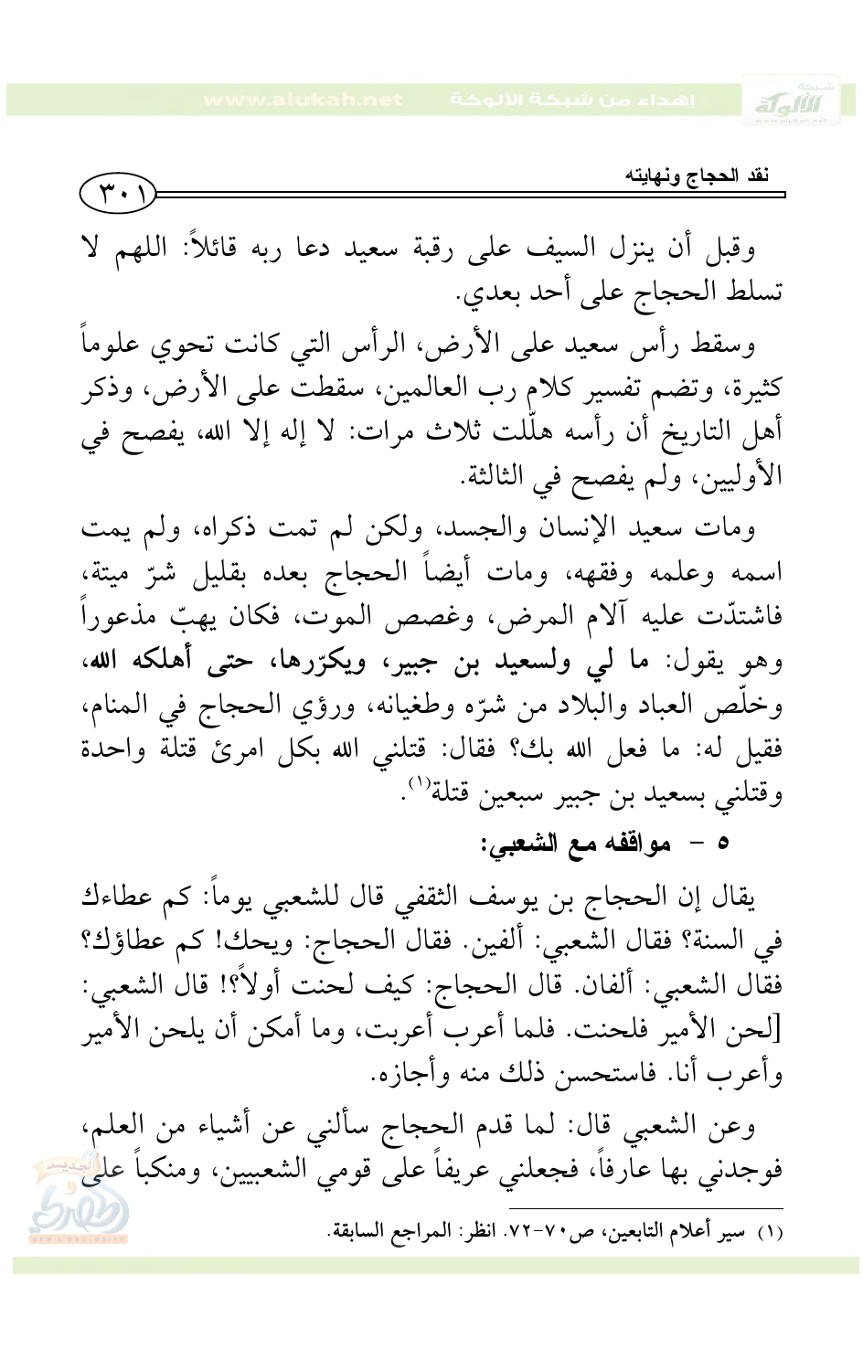 وعن الحسن قال: لما أُتي الحجاج بسعيد بن جبير، قال: أنت الشقي ابن كسير؟ قال: بل أنا سعيد بن جبير، قال: بل أنت الشقي ابن كسير، قال: كانت أمي أعرف باسمي منك، قال: ما تقول في محمدٍ؟ قال: تعني النبي - صلى الله عليه وسلم -، قال: نعم، قال: سيد ولد آدم؛ النبي المصطفى خير من بقي، وخير من مضى، قال: فما تقول في أبي