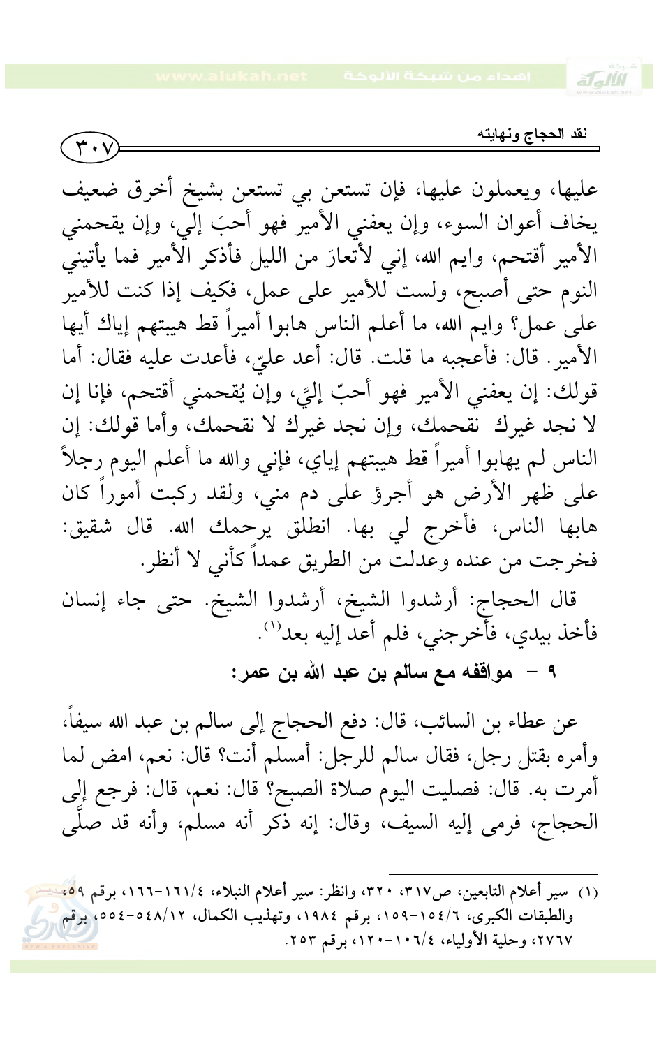 وعن زيد بن عبد الرحمن بن زيد بن الخطاب قال: وفدت مع أبان بن عثمان على عبد الملك بن مروان وعنده ابن الحنفية، فدعا عبد الملك بسيف النبي - صلى الله عليه وسلم -، فأتي به، ودعا بصيقل فنظر إليه فقال: ما رأيت حديدة قط أجود منها. قال عبد الملك: ولا والله ما أرى الناس مثل صاحبها، يا محمد هبْ لي هذا السيف، فقال محمد: أينا رأيت أحقّ به فليأخذه. قال عبد الملك: إن كان لك قرابة، فلكلٍّ قرابة وحق، قال: فأعطاه محمدٌ عبدَ الملك، وقال: يا أمير المؤمنين إن هذا - يعني الحجاج وهو عنده - قد آذاني، واستخفّ بحقي، ولو كانت خمسة دراهم أرسل إليّ فيها، فقال عبد الملك: لا إمرة لك عليه. فلما ولّى محمد، قال عبد الملك للحجاج: أدركه فسُلّ سخيمته. فأدركه فقال: إن أمير المؤمنين أرسلني إليك لأسلّ سخيمتك، ولا مرحباً بشيء ساءك. فقال محمد. ويحك يا حجاج، اتقّ الله، واحذر الله، ما من صباح يصبحه العباد إلا لله في كل عبد من عباده ثلاثمائة وستون لحظة، إن أخذ أخذ بمقدرة، وإن عفا عفا بحلم، فاحذر الله. فقال له الحجاج: لا تسألني شيئاً إلا أعطيتكه، فقال له محمد: وتفعل؟ قال له الحجاج: نعم. قال: فإني أسألك صَرم الدهر. قال فذكر الحجاج ذلك لعبد الملك، فأرسل عبد الملك إلى رأس الجالوت، فذكر له الذي قال محمد، وقال: إن رجلاً منا ذكر حديثاً ما سمعناه إلا منه. وأخبره بقول محمد، فقال رأس الجالوت: ما