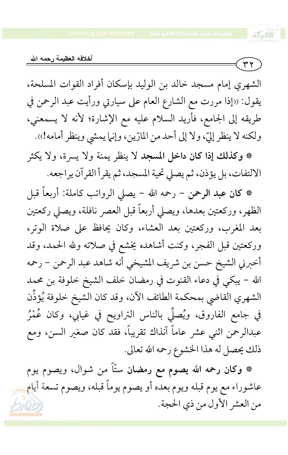 * كان عبد الرحمن - رحمه الله - يصلي الرواتب كاملة: أربعاً قبل الظهر، وركعتين بعدها، ويصلي أربعاً قبل العصر نافلة، ويصلي ركعتين بعد المغرب، وركعتين بعد العشاء، وكان يحافظ على صلاة الوتر، وركعتين قبل الفجر، وكنت أشاهده يخشع في صلاته ولله الحمد، وقد أخبرني الشيخ حسن بن شريف المشيخي أنه شاهد عبد الرحمن - رحمه الله - يبكي في دعاء القنوت في رمضان خلف الشيخ خلوفة بن محمد الشهري القاضي بمحكمة الطائف الآن، وقد كان الشيخ خلوفة يُؤذِّن في جامع الفاروق، ويُصلِّي بالناس التراويح في غيابي، وكان عُمْرُ عبد الرحمن اثني عشر عاماً آنذاك تقريباً، فقد كان صغير السن، ومع ذلك يحصل له هذا الخشوع رحمه الله تعالى.