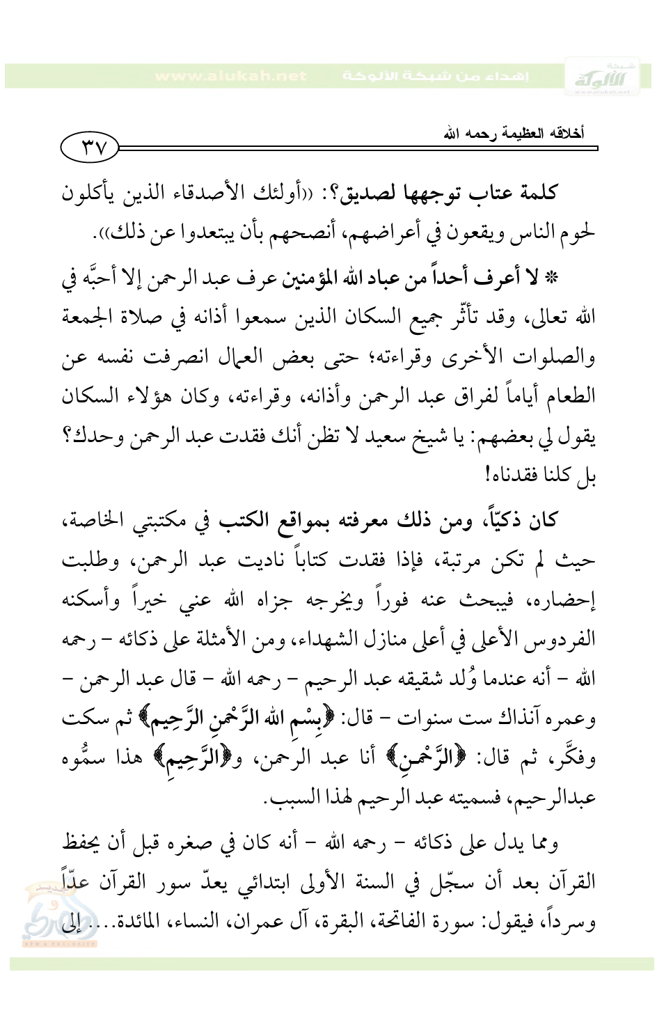 * لا أعرف أحداً من عباد الله المؤمنين عرف عبد الرحمن إلا أحبَّه في الله تعالى، وقد تأثّر جميع السكان الذين سمعوا أذانه في صلاة الجمعة والصلوات الأخرى وقراءته؛ حتى بعض العمال انصرفت نفسه عن الطعام أياماً لفراق عبد الرحمن وأذانه، وقراءته، وكان هؤلاء السكان يقول لي بعضهم: يا شيخ سعيد لا تظن أنك فقدت عبد الرحمن وحدك؟ بل كلنا فقدناه!