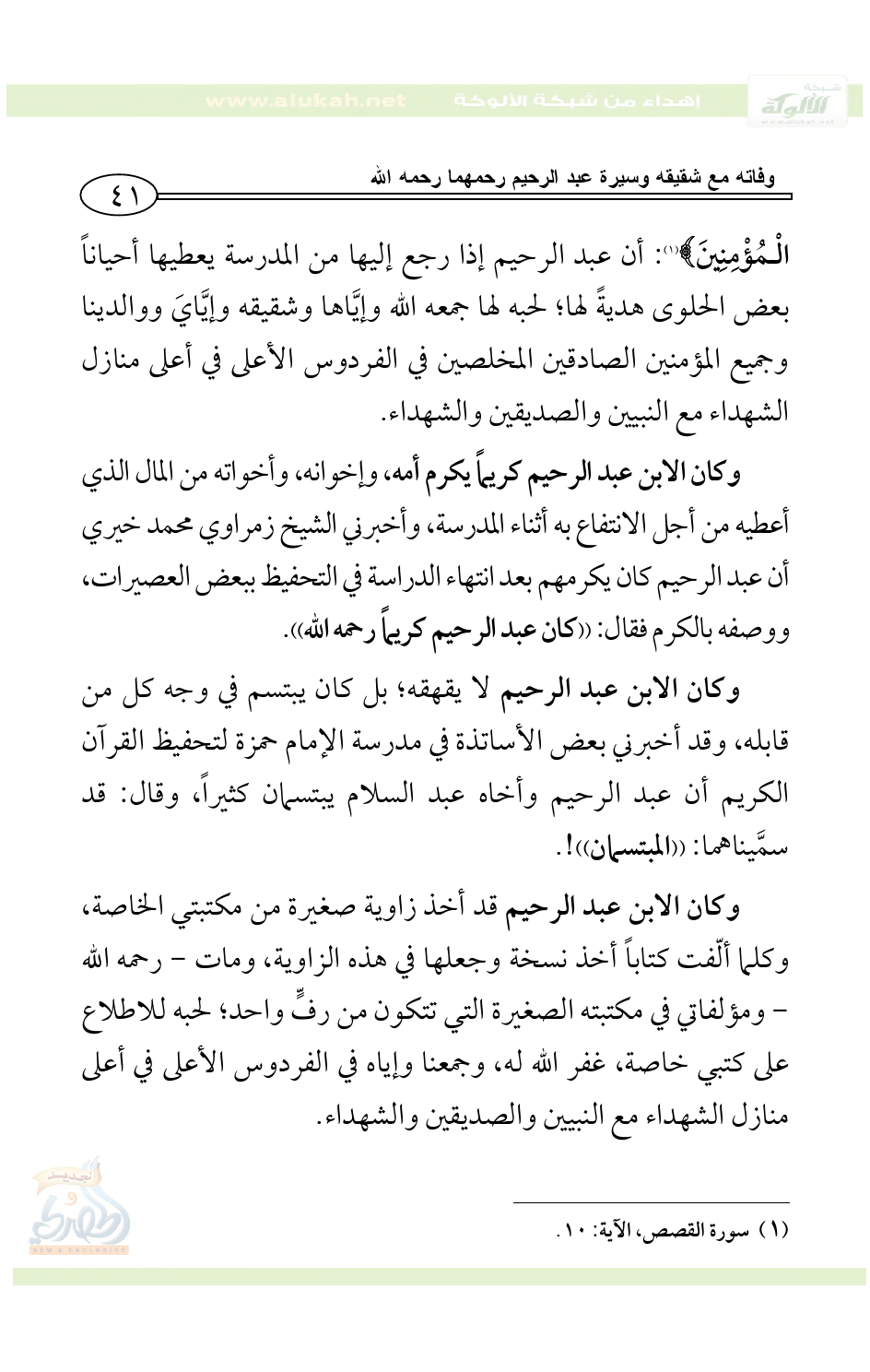 الْمُؤْمِنِينَ} (¬1): أن عبد الرحيم إذا رجع إليها من المدرسة يعطيها أحياناً بعض الحلوى هديةً لها؛ لحبه لها جمعه الله وإيَّاها وشقيقه وإيَّايَ ووالدينا وجميع المؤمنين الصادقين المخلصين في الفردوس الأعلى في أعلى منازل الشهداء مع النبيين والصديقين والشهداء.