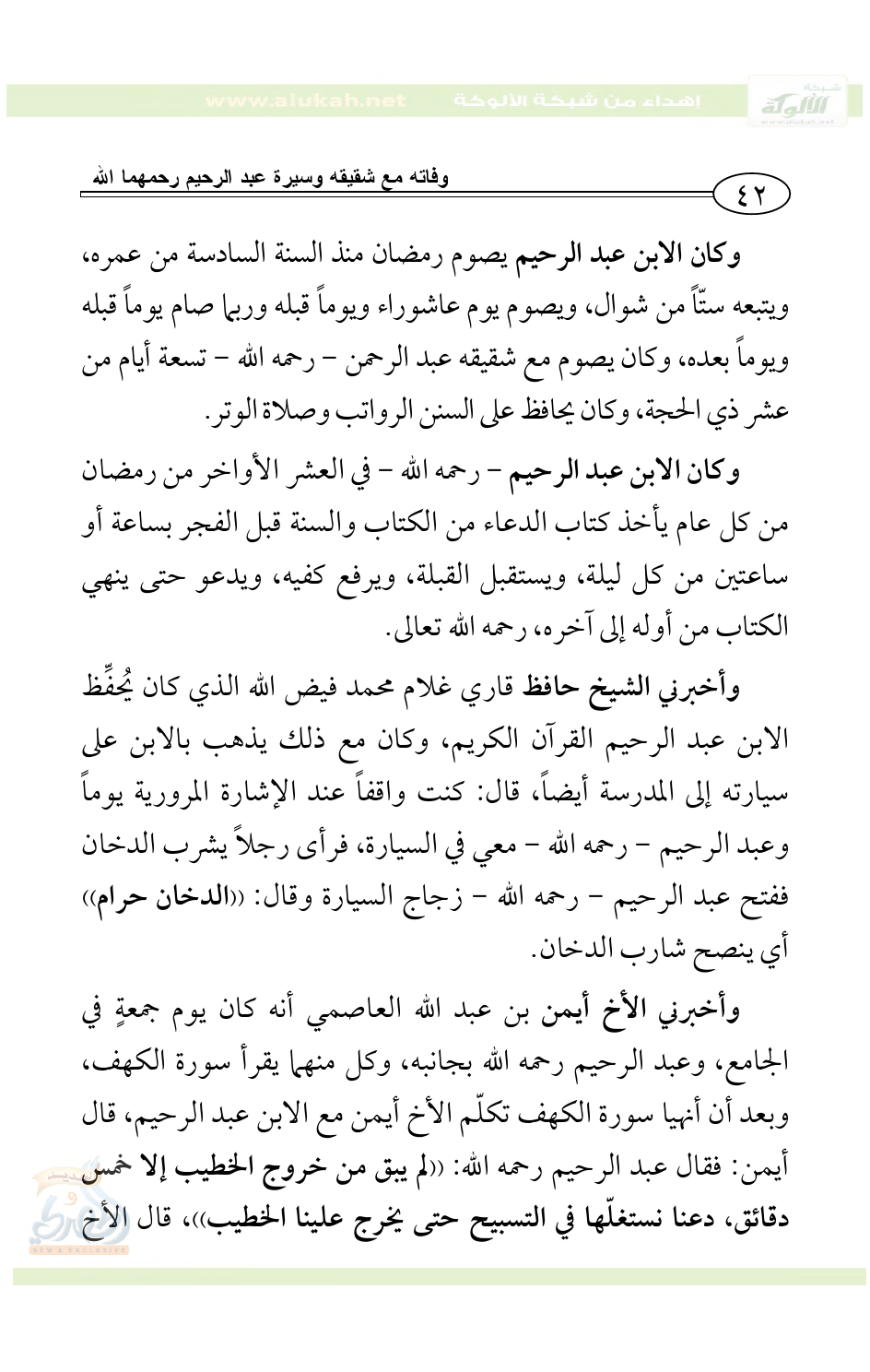وكان الابن عبد الرحيم - رحمه الله - في العشر الأواخر من رمضان من كل عام يأخذ كتاب الدعاء من الكتاب والسنة قبل الفجر بساعة أو ساعتين من كل ليلة، ويستقبل القبلة، ويرفع كفيه، ويدعو حتى ينهي الكتاب من أوله إلى آخره، رحمه الله تعالى.