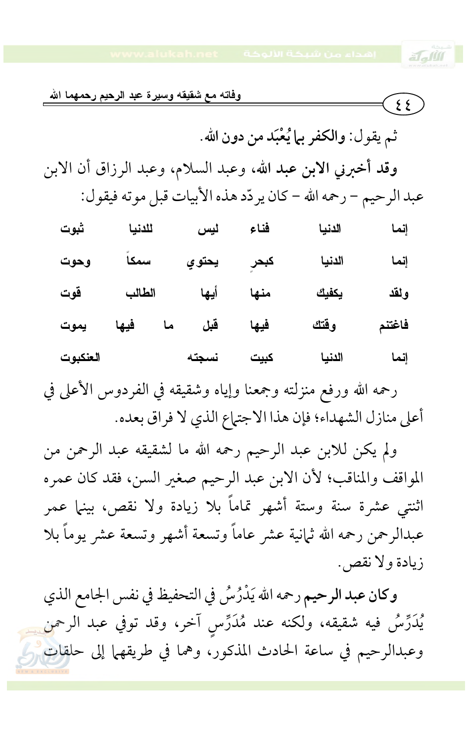 وقد أخبرني الابن عبد الله، وعبد السلام، وعبد الرزاق أن الابن عبد الرحيم - رحمه الله - كان يردّد هذه الأبيات قبل موته فيقول:
