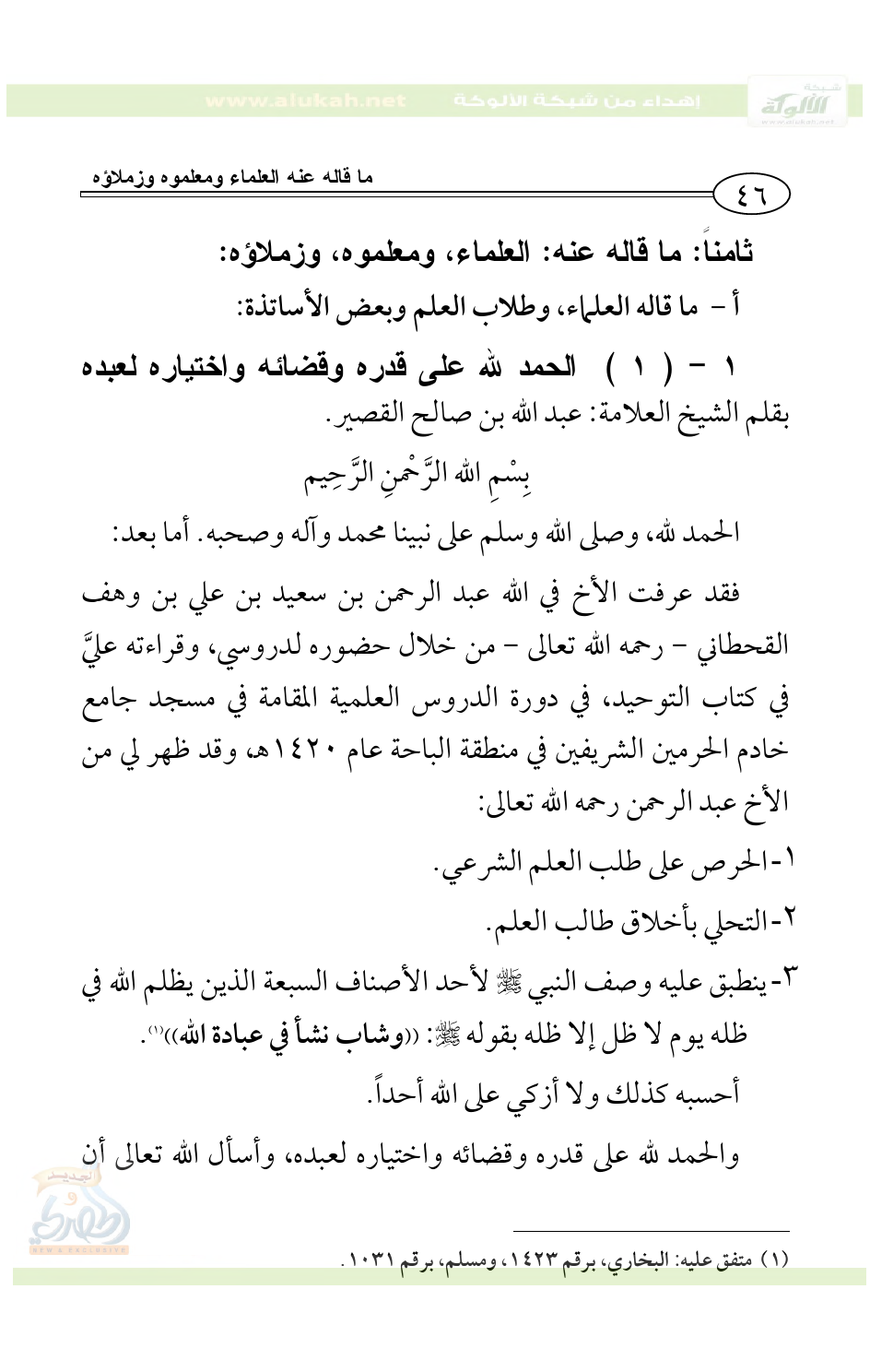 1 - (1) الحمد لله على قدره وقضائه واختياره لعبده بقلم الشيخ العلامة: عبد الله بن صالح القصير.