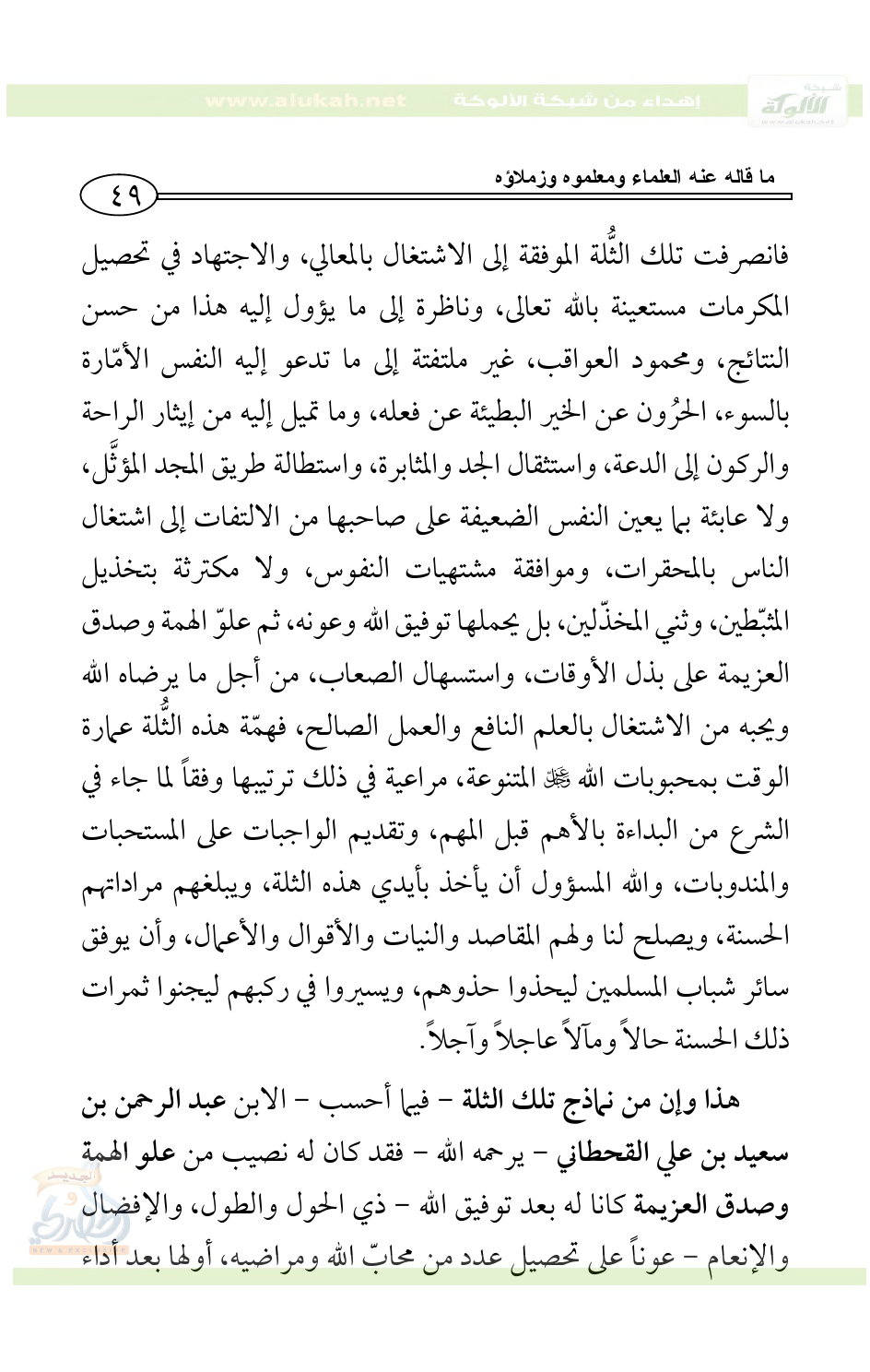 فانصرفت تلك الثُّلة الموفقة إلى الاشتغال بالمعالي، والاجتهاد في تحصيل المكرمات مستعينة بالله تعالى، وناظرة إلى ما يؤول إليه هذا من حسن النتائج، ومحمود العواقب، غير ملتفتة إلى ما تدعو إليه النفس الأمّارة بالسوء، الحرُون عن الخير البطيئة عن فعله، وما تميل إليه من إيثار الراحة والركون إلى الدعة، واستثقال الجد والمثابرة، واستطالة طريق المجد المؤثَّل، ولا عابئة بما يعين النفس الضعيفة على صاحبها من الالتفات إلى اشتغال الناس بالمحقرات، وموافقة مشتهيات النفوس، ولا مكترثة بتخذيل المثبّطين، وثني المخذّلين، بل يحملها توفيق الله وعونه، ثم علوّ الهمة وصدق العزيمة على بذل الأوقات، واستسهال الصعاب، من أجل ما يرضاه الله ويحبه من الاشتغال بالعلم النافع والعمل الصالح، فهمّة هذه الثُّلة عمارة الوقت بمحبوبات الله - عز وجل - المتنوعة، مراعية في ذلك ترتيبها وفقاً لما جاء في الشرع من البداءة بالأهم قبل المهم، وتقديم الواجبات على المستحبات والمندوبات، والله المسؤول أن يأخذ بأيدي هذه الثلة، ويبلغهم مراداتهم الحسنة، ويصلح لنا ولهم المقاصد والنيات والأقوال والأعمال، وأن يوفق سائر شباب المسلمين ليحذوا حذوهم، ويسيروا في ركبهم ليجنوا ثمرات ذلك الحسنة حالاً ومآلاً عاجلاً وآجلاً.