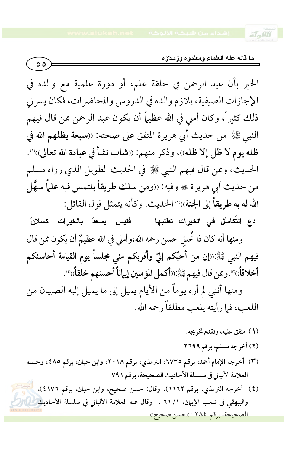 الإجازات الصيفية، يلازم والده في الدروس والمحاضرات، فكان يسرني ذلك كثيراً، وكان أملي في الله عظيماً أن يكون عبد الرحمن ممن قال فيهم النبي - صلى الله عليه وسلم - من حديث أبي هريرة المتفق على صحته: ((سبعة يظلهم الله في ظله يوم لا ظل إلا ظله))، وذكر منهم: ((شاب نشأ في عبادة الله تعالى)) (¬1). الحديث، وممن قال فيهم النبي - صلى الله عليه وسلم - في الحديث الطويل الذي رواه مسلم من حديث أبي هريرة - رضي الله عنه - وفيه: ((ومن سلك طريقاً يلتمس فيه علماً سهَّل الله له به طريقاً إلى الجنة)) (¬2) الحديث. وكأنه يتمثل قول القائل: