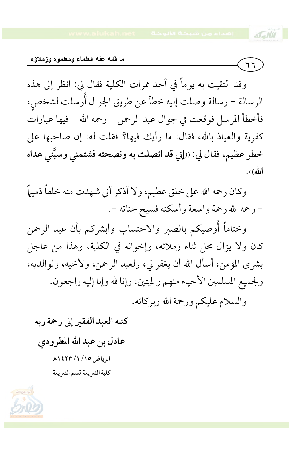 وختاماً أُوصيكم بالصبر والاحتساب وأبشركم بأن عبد الرحمن كان ولا يزال محل ثناء زملائه، وإخوانه في الكلية، وهذا من عاجل بشرى المؤمن، أسأل الله أن يغفر لي، ولعبد الرحمن، ولأخيه، ولوالديه، ولجميع المسلمين الأحياء منهم والميتين، وإنا لله وإنا إليه راجعون.