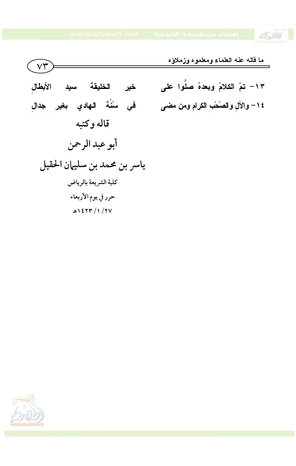14 - والآلِ والصَّحْبِ الكرامِ ومن مضى ... في سُنَّةِ الهادي بغيرِ جِدالِ