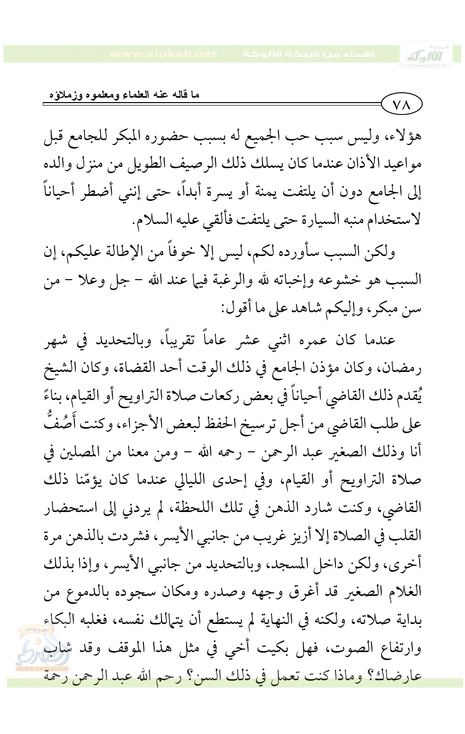 هؤلاء، وليس سبب حب الجميع له بسبب حضوره المبكر للجامع قبل مواعيد الأذان عندما كان يسلك ذلك الرصيف الطويل من منزل والده إلى الجامع دون أن يلتفت يمنة أو يسرة أبداً، حتى إنني أضطر أحياناً لاستخدام منبه السيارة حتى يلتفت فألقي عليه السلام.