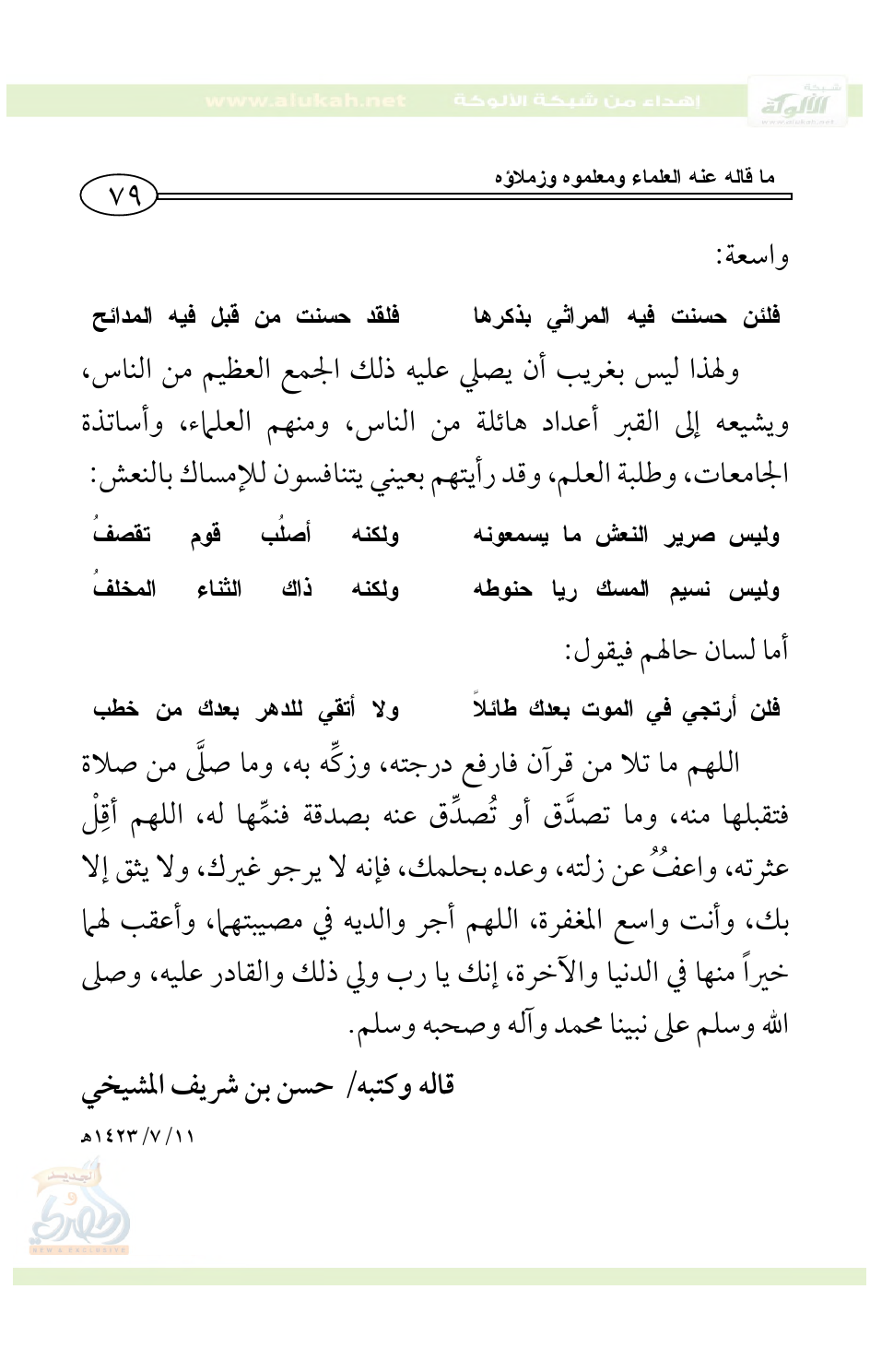 اللهم ما تلا من قرآن فارفع درجته، وزكِّه به، وما صلَّى من صلاة فتقبلها منه، وما تصدَّق أو تُصدِّق عنه بصدقة فنمِّها له، اللهم أقِلْ عثرته، واعفُُ عن زلته، وعده بحلمك، فإنه لا يرجو غيرك، ولا يثق إلا بك، وأنت واسع المغفرة، اللهم أجر والديه في مصيبتهما، وأعقب لهما خيراً منها في الدنيا والآخرة، إنك يا رب ولي ذلك والقادر عليه، وصلى الله وسلم على نبينا محمد وآله وصحبه وسلم.