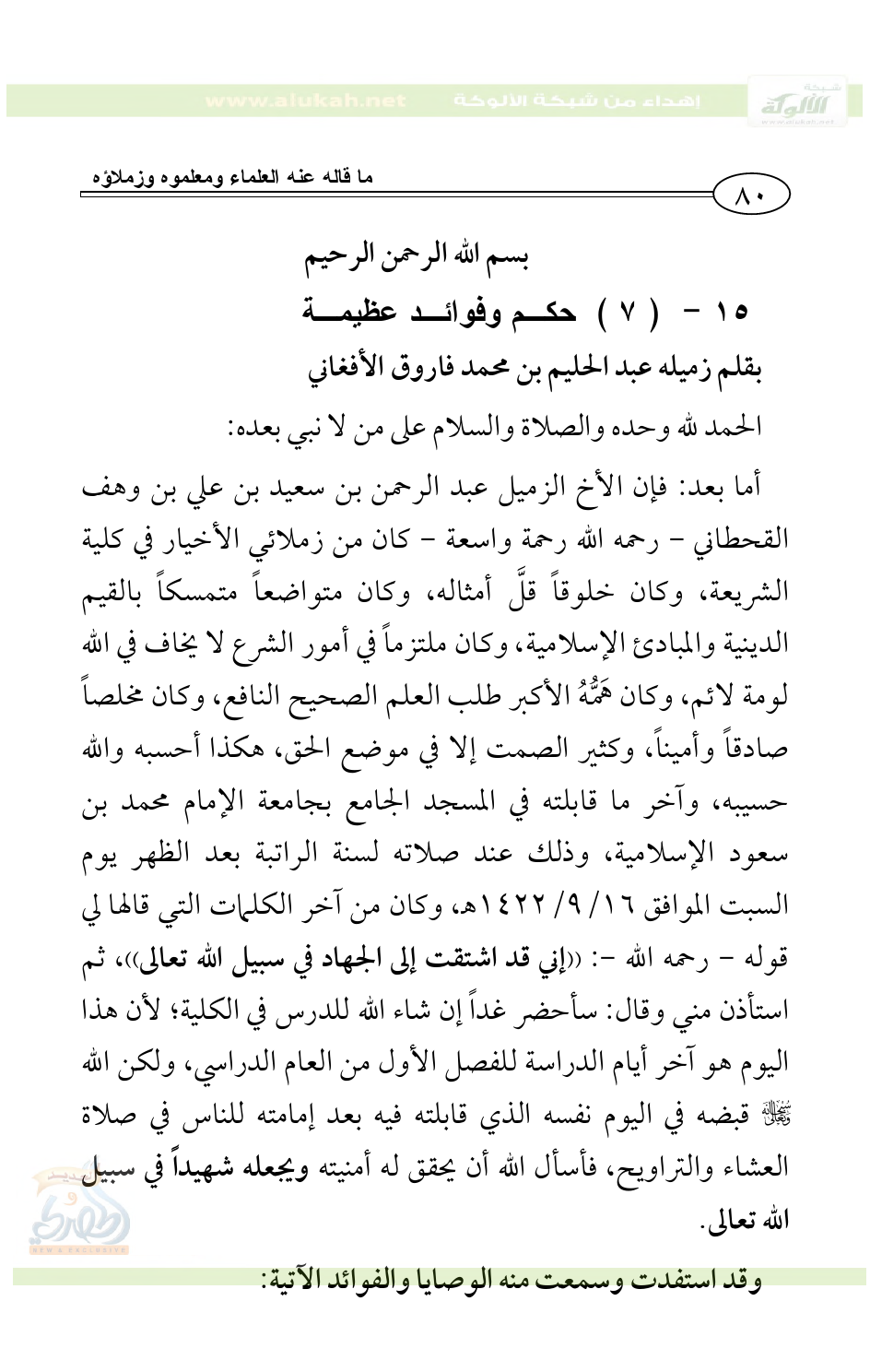 أما بعد: فإن الأخ الزميل عبد الرحمن بن سعيد بن علي بن وهف القحطاني - رحمه الله رحمة واسعة - كان من زملائي الأخيار في كلية الشريعة، وكان خلوقاً قلَّ أمثاله، وكان متواضعاً متمسكاً بالقيم الدينية والمبادئ الإسلامية، وكان ملتزماً في أمور الشرع لا يخاف في الله لومة لائم، وكان هَمُّهُ الأكبر طلب العلم الصحيح النافع، وكان مخلصاً صادقاً وأميناً، وكثير الصمت إلا في موضع الحق، هكذا أحسبه والله حسيبه، وآخر ما قابلته في المسجد الجامع بجامعة الإمام محمد بن سعود الإسلامية، وذلك عند صلاته لسنة الراتبة بعد الظهر يوم السبت الموافق 16/ 9/1422هـ، وكان من آخر الكلمات التي قالها لي قوله - رحمه الله -: ((إني قد اشتقت إلى الجهاد في سبيل الله تعالى))، ثم استأذن مني وقال: سأحضر غداً إن شاء الله للدرس في الكلية؛ لأن هذا اليوم هو آخر أيام الدراسة للفصل الأول من العام الدراسي، ولكن الله - سبحانه وتعالى - قبضه في اليوم نفسه الذي قابلته فيه بعد إمامته للناس في صلاة العشاء والتراويح، فأسأل الله أن يحقق له أمنيته ويجعله شهيداً في سبيل الله تعالى.
