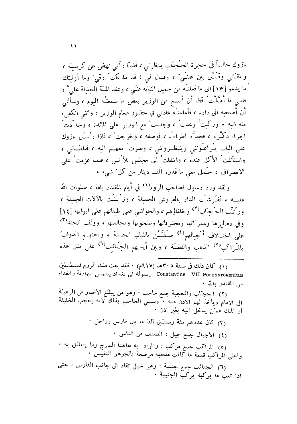 وَلَقَد ورد رَسُول لصَاحب الرّوم فِي أَيَّام المقتدر بِاللَّه صلوَات الله عَلَيْهِ ففرشت الدَّار بالفروش الجميلة وزينت بالآلات الجليلة ورتب الْحجاب وخلفاؤهم والحواشي على طبقاتهم على أَبْوَابهَا وَفِي دهاليزها وممراتها ومخترقاتها وصحونها ومجالسها ووقف الْجند على اخْتِلَاف أجيالهم صفّين بالثياب الْحَسَنَة وتحتهم الدَّوَابّ بالمراكب الذَّهَب وَالْفِضَّة وَبَين أَيْديهم الجنائب على مثل هَذِه