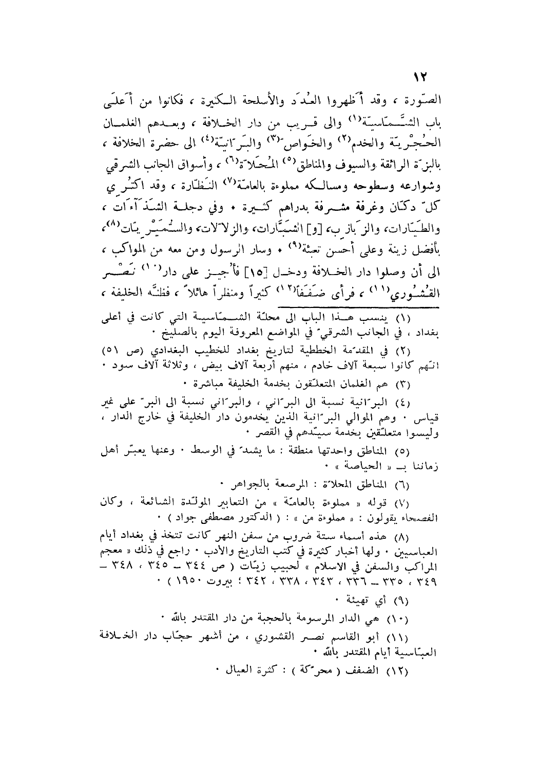 الصُّورَة وَقد أظهرُوا الْعدَد والأسلحة الْكَثِيرَة فَكَانُوا من أَعلَى بَاب الشماسية وَإِلَى قريب من دَار الْخلَافَة وبعدهم الغلمان الحجرية والخدم والخواص والبرانية إِلَى حَضْرَة الْخلَافَة بالبزة الرائقة وَالسُّيُوف والمناطق المحلاة وأسواق الْجَانِب الشَّرْقِي وشوارعه وسطوحة ومسالكه مَمْلُوءَة بالعامة النظارة وَقد اكتري كل دكان وغرفة مشرفة بِدَرَاهِم كَثِيرَة وَفِي دجلة الشذاءات والطيارات والزبازب والشبارات والزلالات والسميريات بِأَفْضَل زِينَة وعَلى أحسن تعبئة وَسَار الرَّسُول وَمن مَعَه من المواكب إِلَى أَن وصلوا دَار الْخلَافَة وَدخل فأجيز على دَار نصر القشوري فَرَأى ضففا كثيرا ومنظرا هائلا فَظَنهُ الْخَلِيفَة