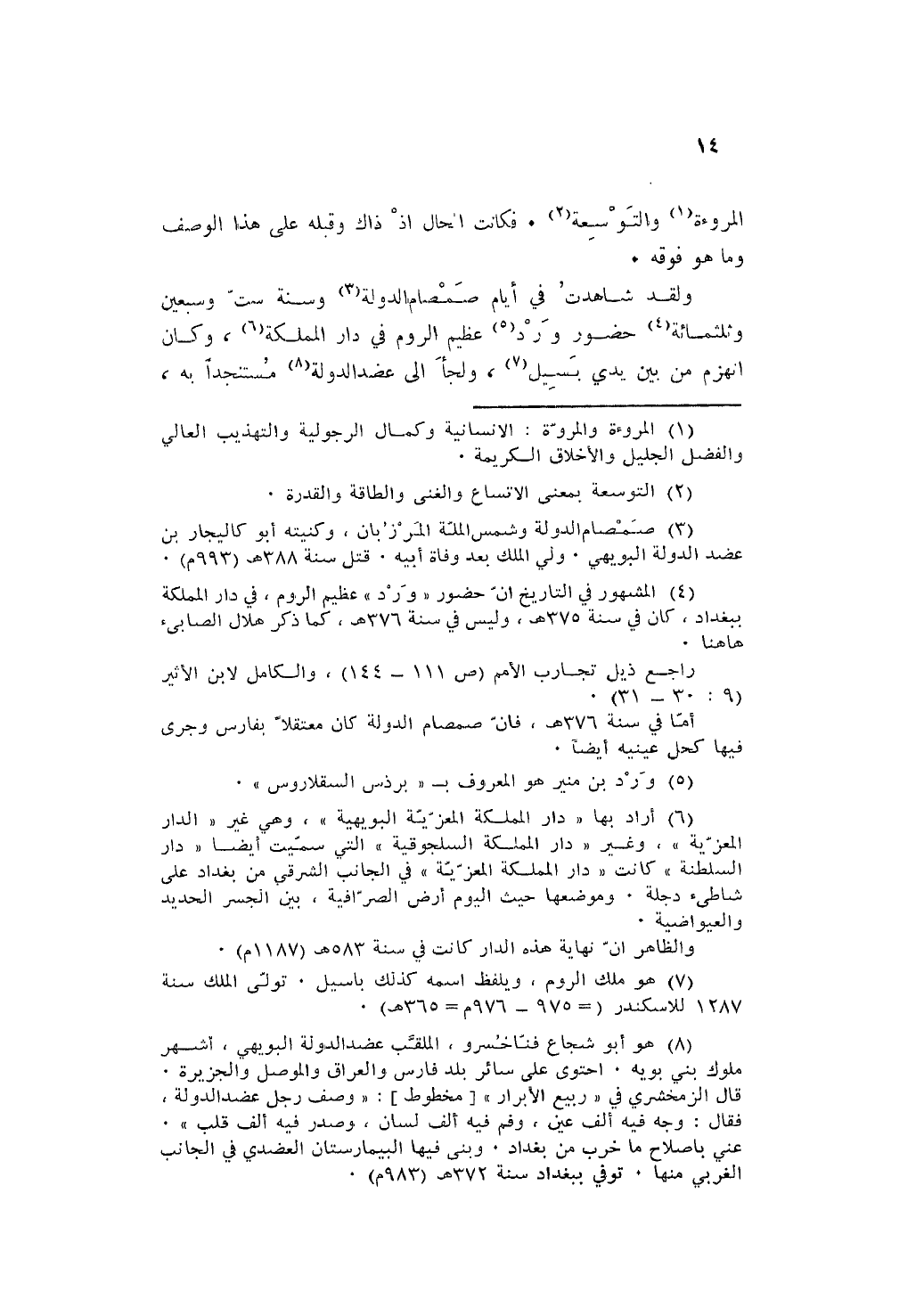 وَلَقَد شاهدت فِي أَيَّام صمصام الدولة وَسنة سِتّ وَسبعين وثلثمائة حُضُور ورد عَظِيم الرّوم فِي دَار المملكة وَكَانَ انهزم من بَين يَدي بسيل ولجأ إِلَى عضد الدولة مستنجدا بِهِ