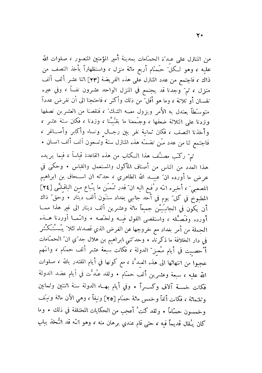 من الْمنَازل على عدَّة الحمامات بِمَدِينَة أَمِير الْمُؤمنِينَ الْمَنْصُور صلوَات الله عَلَيْهِ وَهُوَ لكل حمام أَربع مائَة منزل واستظهارا بِأخذ النّصْف من ذَاك فَاجْتمع من عدد الْمنَازل على هَذِه الْفَرِيضَة اثْنَا عشر ألف ألف منزل ثمَّ وجدنَا قد يجْتَمع فِي الْمنزل الْوَاحِد عشرُون نفسا وَفِي غَيره نفسان اَوْ ثَلَاثَة وَمَا هُوَ أقل من ذَلِك وَأكْثر فاحتجنا إِلَى ان نفرض عددا متوسطا يعتدل بِهِ الْأَمر وَيَزُول مَعَه الشَّك فنقصنا من الْعشْرين نصفهَا وزدنا على الثَّلَاثَة ضعفها وجمعنا مَا بَقينَا وزدنا فَكَانَ سِتَّة عشر وأخذنا النّصْف فَكَانَ ثَمَانِيَة نفر بَين رجال وَنسَاء وأكابر وأصاغر فَاجْتمع لنا من عدد من تضمه هَذِه الْمنَازل سِتَّة وَتسْعُونَ ألف ألف انسان.