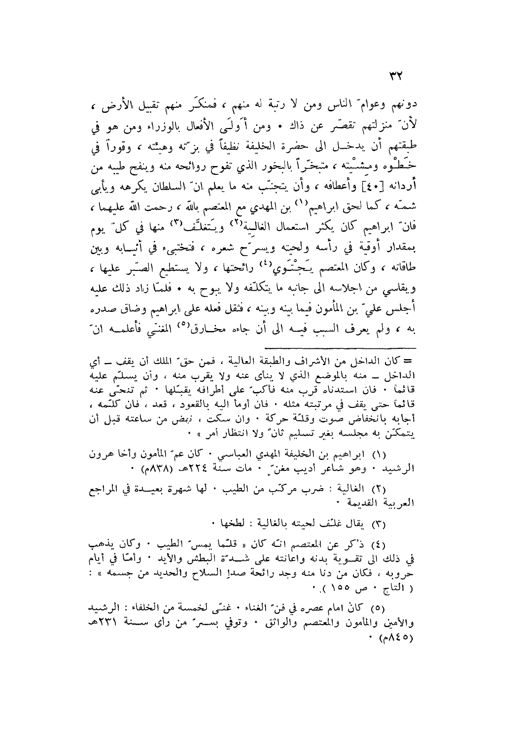 دونهم وعوام النَّاس وَمن لَا رُتْبَة لَهُ مِنْهُم فمنكر مِنْهُم تَقْبِيل الأَرْض لِأَن مَنْزِلَتهمْ تقصر عَن ذَاك وَمن أولى الْأَفْعَال بالوزراء وَمن هُوَ فِي طبقتهم ان يدْخل إِلَى حَضْرَة الْخَلِيفَة نظيفا فِي بزته وهيئته وقوراً فِي خطْوَة ومشيته متبخراً بالبخور الَّذِي تفوح روائحه مِنْهُ وينفح طيبه من أردانه وأعطافه وَأَن يتَجَنَّب مِنْهُ مَا يعلم أَن السُّلْطَان يكرههُ ويأبى شمه كَمَا لحق إِبْرَاهِيم بن الْمهْدي مَعَ المعتصم بِاللَّه رحمت الله عَلَيْهِمَا فَإِن إِبْرَاهِيم كَانَ يكثر اسْتِعْمَال الغالية ويتغلف مِنْهَا فِي كل يَوْم بِمِقْدَار أُوقِيَّة فِي رَأسه ولحيته ويسرح شعره فتختبىء فِي أثيابه وَبَين طاقاته وَكَانَ المعتصم يجتوي رائحتها وَلَا يَسْتَطِيع الصَّبْر عَلَيْهَا ويقاسي من اجلاسه إِلَى جَانِبه مَا يتكلفه وَلَا يبوح بِهِ فَلَمَّا زَاد ذَلِك عَلَيْهِ أَجْلِس عَليّ بن الْمَأْمُون فِيمَا بَينه وَبَينه فثقل فعله على إِبْرَاهِيم وضاق صَدره بِهِ وَلم يعرف السَّبَب فِيهِ إِلَى ان جَاءَهُ مُخَارق الْمُغنِي فَأعلمهُ ان