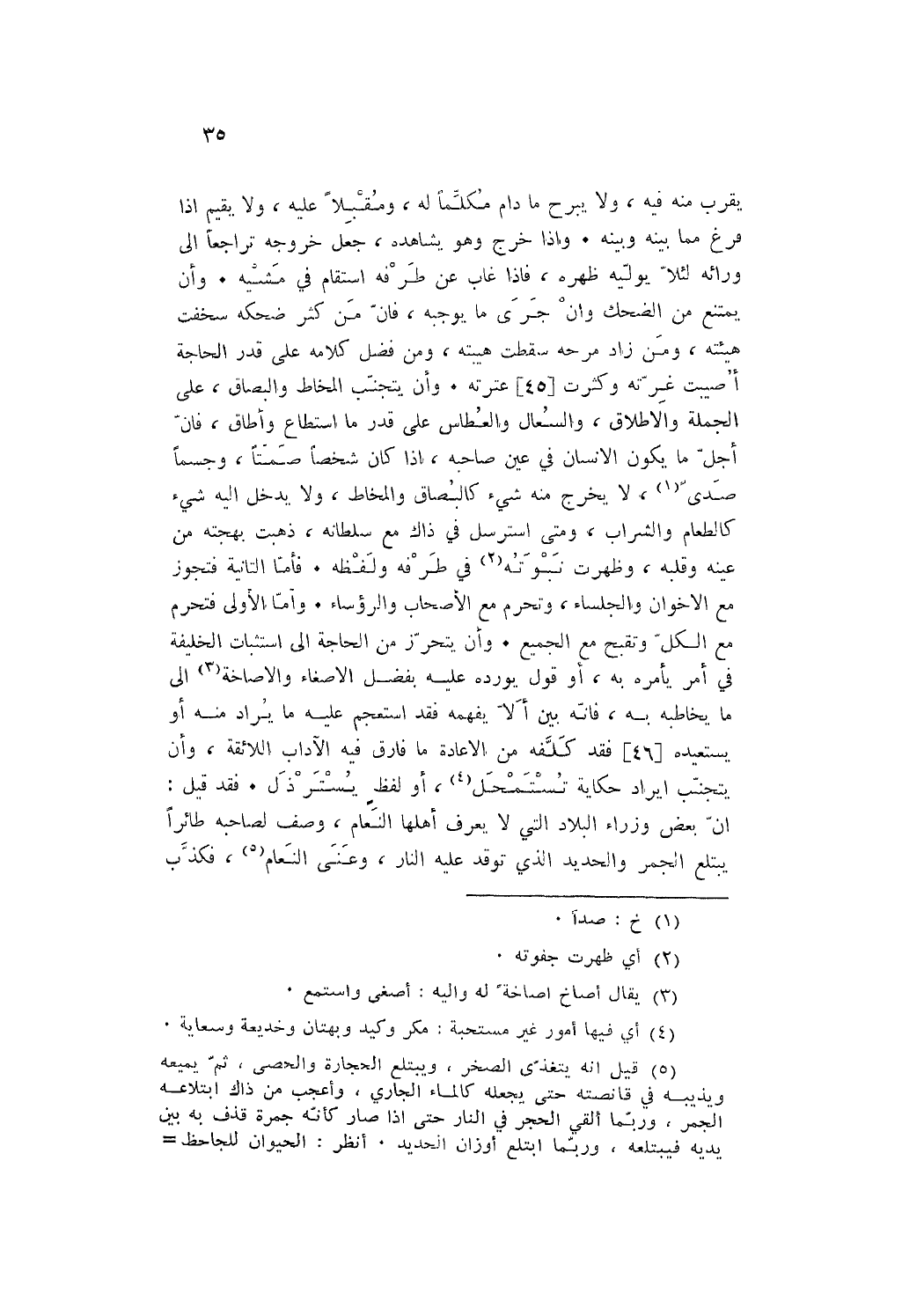 يقرب مِنْهُ فِيهِ وَلَا يبرح مَا دَامَ مكلما لَهُ ومقبلا عَلَيْهِ وَلَا يُقيم إِذا فرغ مِمَّا بَينه وَبَينه وَإِذا خرج وَهُوَ يُشَاهِدهُ جعل خُرُوجه تراجعا إِلَى وَرَائه لِئَلَّا يوليه ظَهره فَإِذا غَابَ عَن طرفه استقام فِي مَشْيه وان يمْتَنع من الضحك وان جرى مَا يُوجِبهُ فان من كثر ضحكة سخفت هَيئته وَمن زَاد مرحة سَقَطت هيبته وَمن فضل كَلَامه على قدر الْحَاجة أُصِيبَت غرته وَكَثُرت عثرته وَأَن يتَجَنَّب المخاط والبصاق على الْجُمْلَة وَالْإِطْلَاق والسعال والعطاس على قدر مَا اسْتَطَاعَ وأطاق فَإِن اجل مَا يكون الْإِنْسَان فِي عين صَاحبه إِذا كَانَ شخصا صمتا وجسما صدى لَا يخرج مِنْهُ شَيْء كالبصاق والمخاط وَلَا يدْخل إِلَيْهِ شَيْء كالطعام وَالشرَاب وَمَتى استرسل فِي ذَاك مَعَ سُلْطَانه فَهبت بهجته من عينه وَقَلبه وَظَهَرت نبوته فِي طرفَة وَلَفظه فَأَما الثَّانِيَة فَتجوز مَعَ الأخوان والجلساء وَتحرم مَعَ الْأَصْحَاب والرؤساء وَأما الأولى فَتحرم مَعَ الْكل وتقبح مَعَ الْجَمِيع وَأَن يتحرز من الْحَاجة إِلَى استثبات الْخَلِيفَة فِي أَمر يَأْمُرهُ بِهِ أَو قَول يُورِدهُ عَلَيْهِ بِفضل الإصغاء والإصاخة إِلَى مَا يخاطبه بِهِ فَإِنَّهُ بَين أَلا يفهمهُ فقد استعجم عَلَيْهِ مَا يُرَاد مِنْهُ أَو يستعيده فقد كلفه من الْإِعَادَة مَا فَارق فِيهِ الْآدَاب اللائقة وَأَن يتَجَنَّب أيراد حِكَايَة تستمحل أَو لفظ يسترذل فقد قيل ان بعض وزراء الْبِلَاد الَّتِي لَا يعرف أَهلهَا النعام وصف لصَاحبه طائرا يبتلع الْجَمْر وَالْحَدِيد الَّذِي توقد عَلَيْهِ النَّار وعنى النعام فكذب