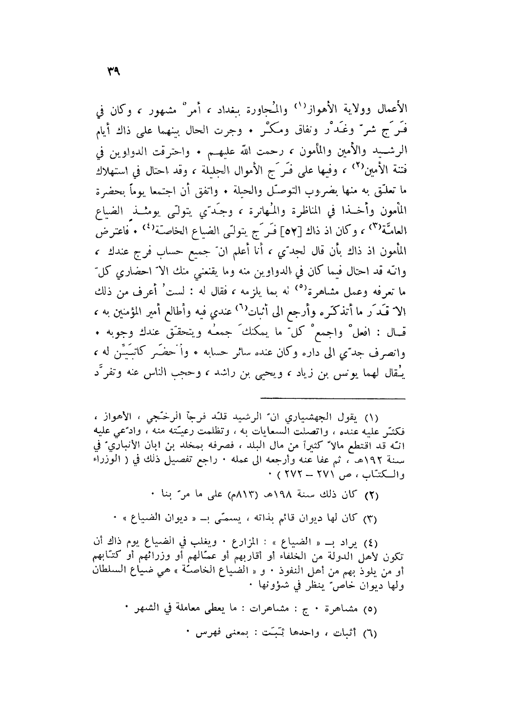 الإعمال وَولَايَة الأهواز والمجاورة بِبَغْدَاد أَمر مَشْهُور وَكَانَ فِي فرج شَرّ وغدر ونفاق ومكر وَجَرت الْحَال بَينهمَا على ذَاك أَيَّام الرشيد والأمين والمأمون رحمت الله عَلَيْهِم واحترقت الدَّوَاوِين فِي فتْنَة الْأمين وفيهَا على فرج الْأَمْوَال الجليلة وَقد احتال فِي اسْتِهْلَاك مَا تعلق بِهِ مِنْهَا بضروب التَّوَصُّل وَالْحِيلَة وَاتفقَ أَن اجْتمعَا يَوْمًا بِحَضْرَة الْمَأْمُون وأخذا فِي المناظرة والمهاترة وجدي يتَوَلَّى يَوْمئِذٍ الضّيَاع الْعَامَّة وَكَانَ إِذْ ذَاك فرج يتَوَلَّى الضّيَاع الْخَاصَّة فَاعْترضَ الْمَأْمُون إِذْ ذَاك بِأَن قَالَ لجدي انا أعلم ان جَمِيع حِسَاب فرج عنْدك وَأَنه قد احتال فِيمَا كَانَ فِي الدَّوَاوِين مِنْهُ وَمَا يقنعني مِنْك إِلَّا إحضاري كل مَا تعرفه وَعمل مشاهرة لَهُ بِمَا يلْزمه فَقَالَ لَهُ: لست أعرف من ذَلِك إِلَّا قدر مَا أتذكره وأرجع إِلَى أثبات عِنْدِي فِيهِ وأطالع أَمِير الْمُؤمنِينَ بِهِ قَالَ: افْعَل واجمع كل مَا يمكنك جمعه ويتحقق عنْدك وُجُوبه وَانْصَرف جدي إِلَى دَاره وَكَانَ عِنْده سَائِر حسابه. وأحضر كاتبين لَهُ يُقَال لَهما يُونُس بن زِيَاد وَيحيى بن رَاشد وحجب النَّاس عَنهُ وَتفرد