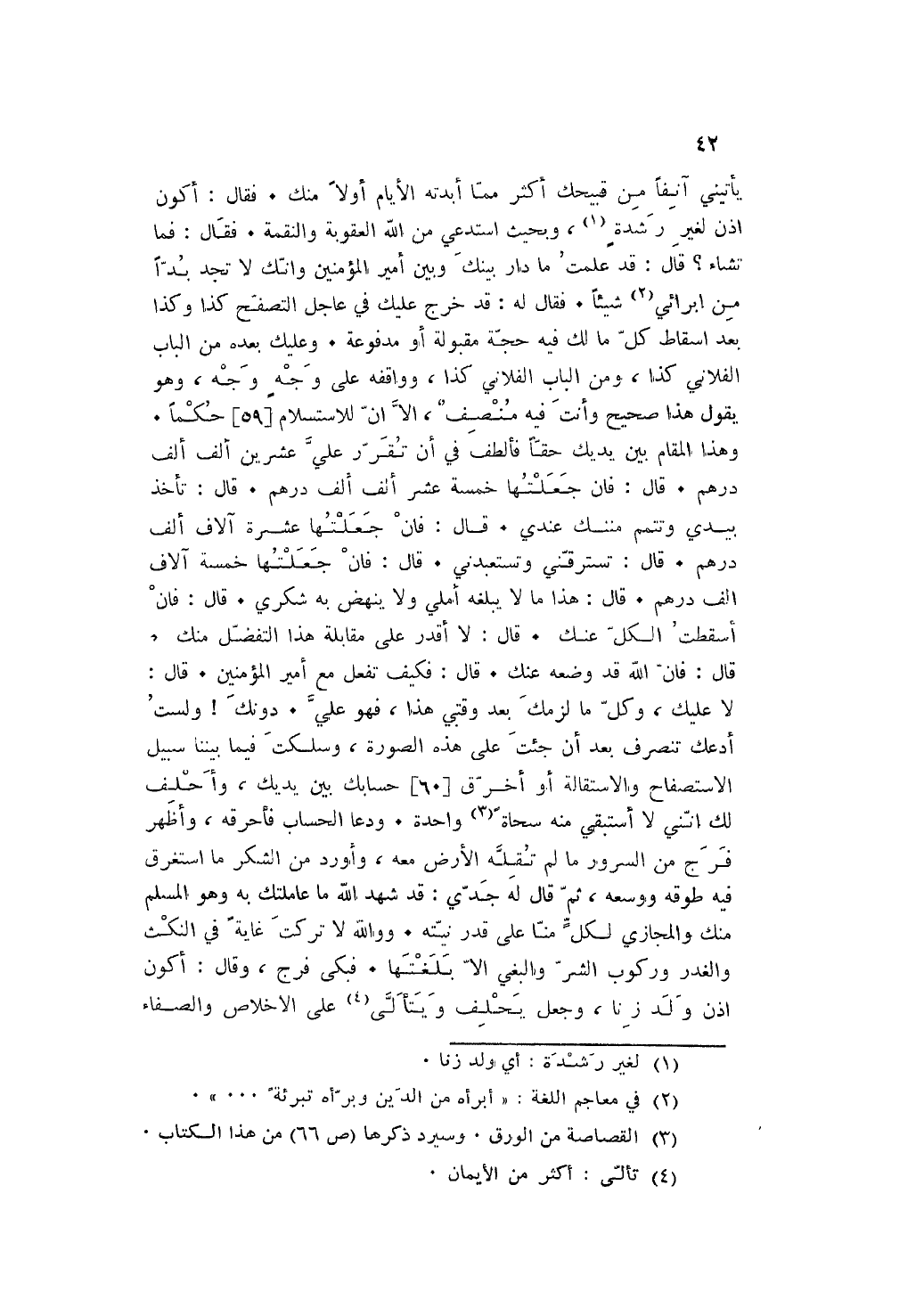 يأتيني آنِفا من قبيحك أَكثر مِمَّا أبدته الْأَيَّام أَولا مِنْك فَقَالَ: أكون إِذن لغير رشدة وبحيث استدعي من الله الْعقُوبَة والنقمة فَقَالَ: فَمَا تشَاء قَالَ: قد علمت مَا دَار بَيْنك وَبَين أَمِير الْمُؤمنِينَ وَأَنَّك لَا تَجِد بدا من إبرائي شَيْئا فَقَالَ لَهُ: قد خرج عَلَيْك فِي عَاجل التصفح كَذَا وَكَذَا بعد إِسْقَاط كل مَا لَك فِيهِ حجَّة مَقْبُولَة أَو مدفوعة وَعَلَيْك بعده من الْبَاب الْفُلَانِيّ كَذَا وَمن الْبَاب الْفُلَانِيّ كَذَا وواقفه على وَجه وَجه وَهُوَ يَقُول هَذَا صَحِيح وانت فِيهِ منصف إِلَّا ان للاستسلام حكما وَهَذَا الْمقَام بَين يَديك حَقًا فألطف فِي ان تقرر عَليّ عشْرين ألف ألف دِرْهَم. قَالَ فان جَعلتهَا خَمْسَة عشر ألف ألف دِرْهَم. قَالَ: تَأْخُذ بيَدي وتتمم مننك عِنْدِي قَالَ: فان جَعلتهَا عشرَة آلَاف ألف دِرْهَم قَالَ: تسترقني وتستعبدني قَالَ: فان جَعلتهَا خَمْسَة آلَاف ألف دِرْهَم قَالَ: هَذَا مَا لَا يبلغهُ أملي وَلَا ينْهض بِهِ شكري قَالَ: فان أسقطت الْكل عَنْك قَالَ: لَا أقدر على مُقَابلَة هَذَا التفضل مِنْك قَالَ: فان الله قد وَضعه عَنْك قَالَ فَكيف تفعل مَعَ أَمِير الْمُؤمنِينَ قَالَ لَا عَلَيْك وكل مَا لزمك بعد وقتي هَذَا فَهُوَ عَليّ دُونك وَلست أدعك تَنْصَرِف بعد ان جِئْت على هَذِه الصُّورَة وسلكت فِيمَا بَيْننَا سَبِيل الاستصفاح والاستقالة أَو أخرق حِسَابك بَين يَديك وأحلف لَك انني لَا اُسْتُبْقِيَ مِنْهُ سحاة وَاحِدَة ودعا الْحساب فأحرقه وَأظْهر فرج من السرُور مَا لم تقله الأَرْض مَعَه وَأورد من الشُّكْر مَا استغرق فِيهِ طوقه ووسعه ثمَّ قَالَ لَهُ جدي: قد شهد الله مَا عاملتك بِهِ وَهُوَ الْمُسلم مِنْك والمجازي لكل منا على قدر نِيَّته وَوَاللَّه لَا تركت غَايَة فِي النكث والغدر وركوب الشَّرّ وَالْبَغي إِلَّا بلغتهَا فَبكى فرج وَقَالَ: أكون إِذن ولد زنا وَجعل يحلف ويتألى على الْإِخْلَاص والصفاء