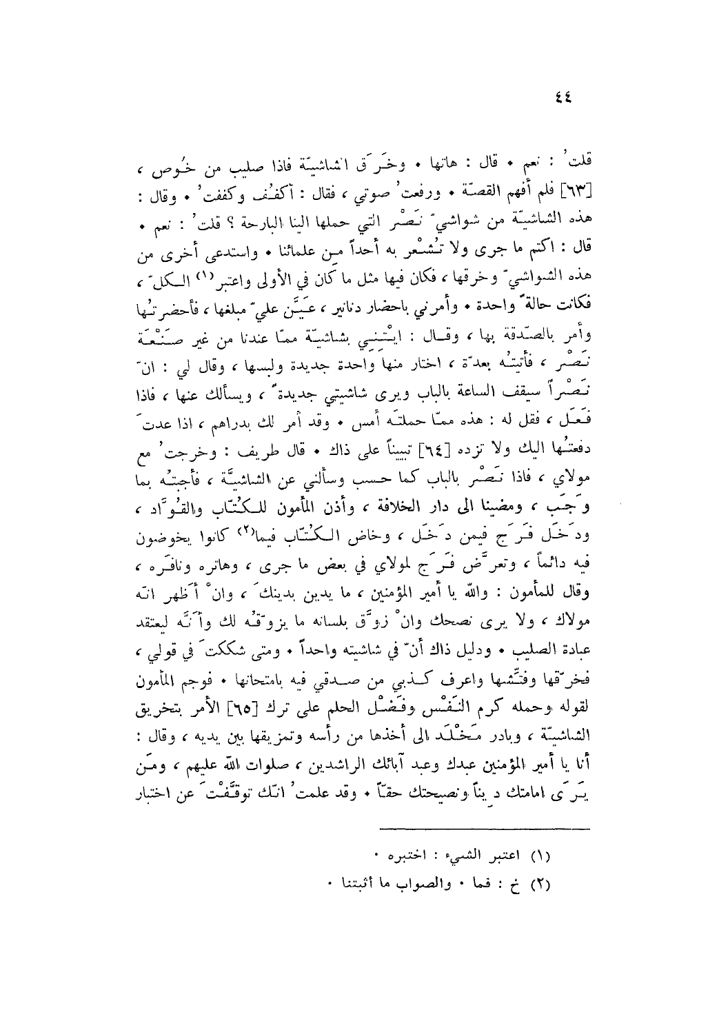 قلت: نعم قَالَ: هَاتِهَا وخرق الشاشية فَإِذا صَلِيب من خوص فَلم أفهم الْقِصَّة وَرفعت صوتي فَقَالَ أكفف وكففت وَقَالَ: هَذِه الشاشية من شواشي نصر الَّتِي حملهَا إِلَيْنَا البارحة قلت: نعم قَالَ: اكتم مَا جرى وَلَا تشعر بِهِ أحدا من عُلَمَائِنَا واستدعى أُخْرَى من هَذِه الشواشي وخرقها فَكَانَ فِيهَا مثل مَا كَانَ فِي الأولى وَاعْتبر الْكل فَكَانَت حَالَة وَاحِدَة وَأَمرَنِي بإحضار دَنَانِير عين عَليّ مبلغها فأحضرتها وَأمر بِالصَّدَقَةِ بهَا وَقَالَ: ايتني بشاشية مِمَّا عندنَا من غير صَنْعَة نصر فَأَتَيْته بعدة اخْتَار مِنْهَا وَاحِدَة جَدِيدَة ولبسها وَقَالَ لي: ان نصرا سيقف السَّاعَة بِالْبَابِ وَيرى شاشيتي جَدِيدَة ويسألك عَنْهَا فَإِذا فعل فَقل لَهُ: هَذِه مِمَّا حَملته أمس وَقد أَمر لَك بِدَرَاهِم إِذا عدت دفعتها إِلَيْك وَلَا تزِدْه تبيينا على ذَاك قَالَ طريف: وَخرجت مَعَ مولَايَ فَإِذا نصر بِالْبَابِ كَمَا حسب وسألني عَن الشاشية فأجبته بِمَا وَجب ومضينا إِلَى دَار الْخلَافَة وَأذن الْمَأْمُون للْكتاب والقواد وَدخل فرج فِيمَن دخل وخاض الْكتاب فِيمَا كَانُوا يَخُوضُونَ فِيهِ دَائِما وَتعرض فرج لمولاي فِي بعض مَا جرى وهاتره ونافره وَقَالَ لِلْمَأْمُونِ: وَالله يَا أَمِير الْمُؤمنِينَ مَا يدين بِدينِك وان أظهر انه مَوْلَاك وَلَا يرى نصحك وَأَن زوق بِلِسَانِهِ مَا يزوقه لَك وَأَنه ليعتقد عبَادَة الصَّلِيب وَدَلِيل ذَاك ان فِي شاشيته وَاحِدًا وَمَتى شَككت فِي قولي فخرقها وفتشها واعرف كذبي من صدقي فِيهِ بامتحانها فَوَجَمَ الْمَأْمُون لقَوْله وَحمله كرم النَّفس وَفضل الْحلم على ترك الْأَمر بتخريق الشاشية وبادر مخلد إِلَى أَخذهَا من رَأسه وتمزيقها بَين يَدَيْهِ وَقَالَ: انا يَا أَمِير الْمُؤمنِينَ عَبدك وَعبد آبَائِك الرَّاشِدين صلوَات الله عَلَيْهِم وَمن يرى إمامتك دينا وَنَصِيحَتِك حَقًا وَقد علمت انك توقفت عَن اختبار