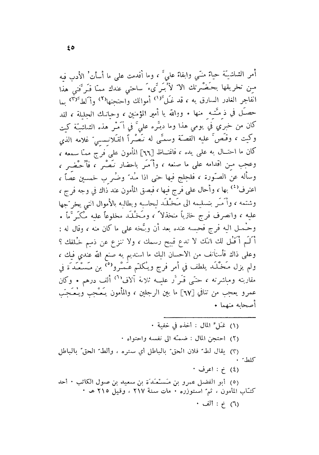 أَمر الشاشية حَيَاء مني وابقاء عَليّ وَمَا أقدمت على مَا أَسَأْت الْأَدَب فِيهِ من تخريقها بحضرتك إِلَّا لأبرىء ساحتي عنْدك مِمَّا قرفني هَذَا الْفَاجِر الغادر السَّارِق بِهِ قد غل أموالك واحتجنها وألط بِمَا حصل فِي ذمَّته مِنْهَا وَوَاللَّه يَا أَمِير الْمُؤمنِينَ وحياتك الجليلة لقد كَانَ من خبري فِي يومي هَذَا وَمَا دبره عَليّ فِي أَمر هَذِه الشاشية كَيْت وَكَيْت وقص عَلَيْهِ الْقِصَّة وَسمي لَهُ نصرا القلانسي غُلَامه الَّذِي كَانَ مَا احتال بِهِ على يَده فاغتاظ الْمَأْمُون على فرج مِمَّا سَمعه وَعجب من إقدامه على مَا صنعه وَأمر باحضار نصر فأحضر وَسَأَلَهُ عَن الصُّورَة فلجلج فِيهَا حَتَّى إِذا مد وَضرب خمسين عَصا اعْترف بهَا وأحال على فرج فِيهَا فبصق الْمَأْمُون عِنْد ذَاك فِي وَجه فرج وَشَتمه وَأمر بِتَسْلِيمِهِ إِلَى مخلد ليحاسبه ويطالبه بالأموال الَّتِي يُخرجهَا عَلَيْهِ وَانْصَرف فرج خازيا منخذلا ومخلد مخلوعا عَلَيْهِ مكرما وَحمل إِلَيْهِ فرج فحبسه عِنْده بعد أَن وبخه على مَا كَانَ مِنْهُ وَقَالَ لَهُ: ألم أقل لَك انك لَا تدع قَبِيح رسمك وَلَا تنْزع عَن ذميم خلقك وعَلى ذَاك فأستأنف من الْإِحْسَان إِلَيْك مَا استديم بِهِ صنع الله عِنْدِي فِيك وَلم يزل مخلد يلطف فِي أَمر فرج ويكلم عَمْرو بن مسْعدَة فِي مقاربته ومباشرته حَتَّى قرر عَلَيْهِ ثَلَاثَة آلَاف ألف دِرْهَم وَكَانَ عَمْرو يعجب من تنَافِي مَا بَين الرجلَيْن والمأمون يعجب ويعجب أَصْحَابه مِنْهُمَا.