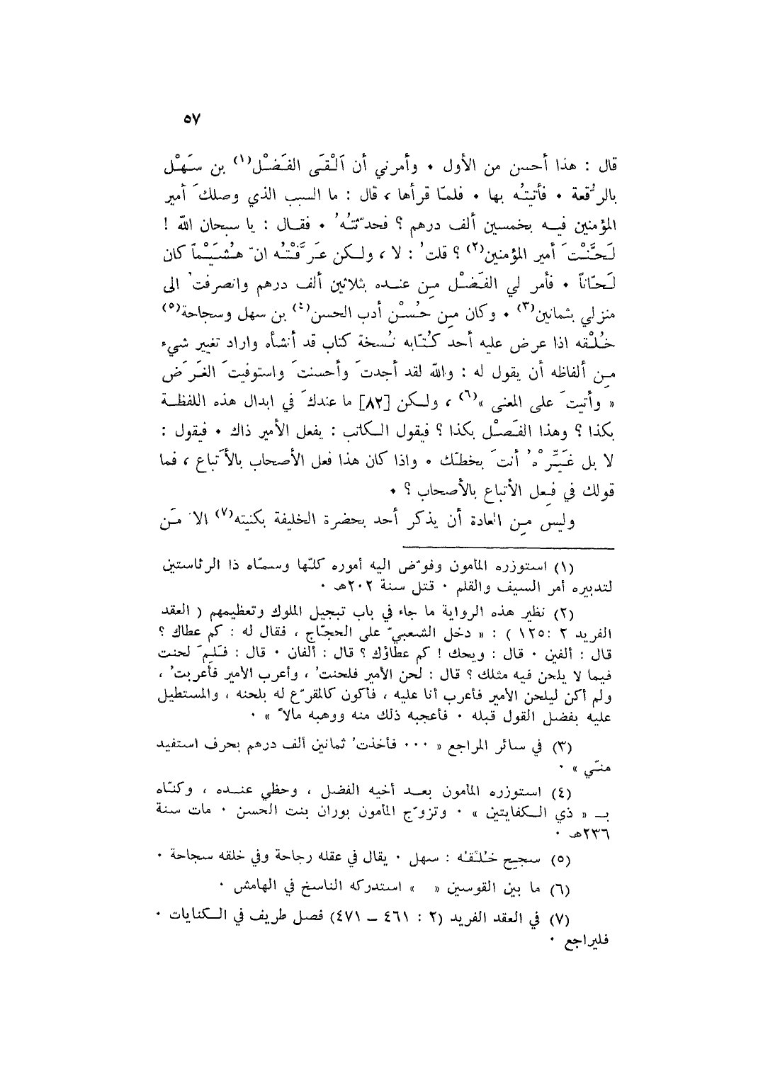 قَالَ: هَذَا أحسن من الأول وَأَمرَنِي ان ألْقى الْفضل بن سهل بالرقعة فَأَتَيْته بهَا فَلَمَّا قَرَأَهَا قَالَ: مَا السَّبَب الَّذِي وصلك أَمِير الْمُؤمنِينَ فِيهِ بِخَمْسِينَ ألف دِرْهَم فَحَدَّثته فَقَالَ: يَا سُبْحَانَ الله لحنت أَمِير الْمُؤمنِينَ قلت: لَا وَلَكِن عَرفته ان هشيما كَانَ لحانا فَأمر لي الْفضل من عِنْده بِثَلَاثِينَ ألف دِرْهَم وانصرفت إِلَى منزلي بِثَمَانِينَ وَكَانَ من حسن أدب الْحسن بن سهل وسجاحة خلقه إِذا عرض عَلَيْهِ أحد كِتَابه نُسْخَة كتاب قد أنشأه وَأَرَادَ تَغْيِير شَيْء من أَلْفَاظه ان يَقُول لَهُ: وَالله لقد أَجدت وأحسنت واستوفيت الْغَرَض وأتيت على الْمَعْنى وَلَكِن مَا عنْدك فِي إِبْدَال هَذِه اللَّفْظَة بِكَذَا وَهَذَا الْفَصْل بِكَذَا فَيَقُول الْكَاتِب: يفعل الْأَمِير ذَاك فَيَقُول: لَا بل غَيره انت بخطك وَإِذا كَانَ هَذَا فعل الْأَصْحَاب بالإتباع فَمَا قَوْلك فِي فعل الإتباع بالأصحاب.