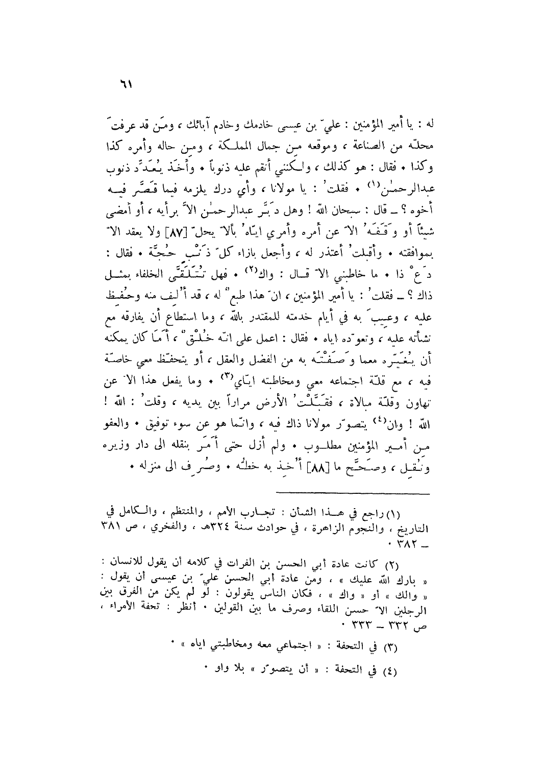 لَهُ: يَا أَمِير الْمُؤمنِينَ: عَليّ بن عِيسَى خادمك وخادم آبَائِك وَمن قد عرفت مَحَله من الصِّنَاعَة وموقعه من جمال المملكة وَمن حَاله وَأمره كَذَا وَكَذَا فَقَالَ: هُوَ كَذَلِك ولكنني انقم عَلَيْهِ ذنوبا وَأخذ يعدد ذنُوب عبد الرَّحْمَن فَقلت: يَا مَوْلَانَا وَأي دَرك يلْزمه فِيمَا قصر فِيهِ أَخُوهُ قَالَ: سُبْحَانَ الله وَهل دبر عبد الرَّحْمَن إِلَّا بِرَأْيهِ أَو أمضى شَيْئا أَو وَقفه إِلَّا عَن أمره وأمري إِيَّاه بألا يحل وَلَا يعْقد إِلَّا بموافقته وَأَقْبَلت أعْتَذر لَهُ وَأَجْعَل بازاء كل ذَنْب حجَّة فَقَالَ دع ذَا مَا خاطبني إِلَّا قَالَ: واك فَهَل تتلقى الْخُلَفَاء بِمثل ذَاك فَقلت: يَا أَمِير الْمُؤمنِينَ ان هَذَا طبع لَهُ قد ألف مِنْهُ وَحفظ عَلَيْهِ وعيب بِهِ فِي أَيَّام خدمته للمقتدر بِاللَّه وَمَا اسْتَطَاعَ ان يُفَارِقهُ مَعَ نشأته عَلَيْهِ وتعوده إِيَّاه فَقَالَ: اعْمَلْ على انه خلق أما كَانَ يُمكنهُ ان يُغَيِّرهُ معما وَصفته بِهِ من الْفضل وَالْعقل أَو يتحفظ معي خَاصَّة فِيهِ مَعَ قلَّة اجتماعه معي ومخاطبته إيَّايَ وَمَا يفعل هَذَا إِلَّا عَن تهاون وَقلة مبالاة فَقبلت الأَرْض مرَارًا بَين يَدَيْهِ وَقلت: الله الله وان يتَصَوَّر مَوْلَانَا ذَاك فِيهِ وَإِنَّمَا هُوَ عَن سوء توفيق وَالْعَفو من أَمِير الْمُؤمنِينَ مَطْلُوب وَلم أزل حَتَّى أَمر بنقله إِلَى دَار وزيره وَنقل وَصحح مَا أَخذ بِهِ خطة وَصرف إِلَى منزله.