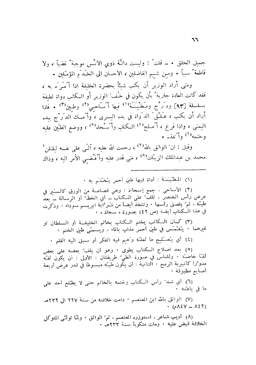 وَمَتى أَرَادَ الْوَزير ان يكْتب شَيْئا بِحَضْرَة الْخَلِيفَة إِذا أمره بِهِ فقد كَانَت الْعَادة جَارِيَة بِأَن يكون فِي خف الْوَزير أَو الْكَاتِب دَوَاة لَطِيفَة بسلسلة ودرج ومطينة فِيهَا أساحي وطين فَإِذا أَرَادَ ان يكْتب علق الدواة فِي يَده الْيُسْرَى وَأمْسك الدرج بِيَدِهِ الْيُمْنَى وَإِذا فرغ أصلح الْكتاب وأسحاه وَوضع الطين عَلَيْهِ وختمه وأنفذه.