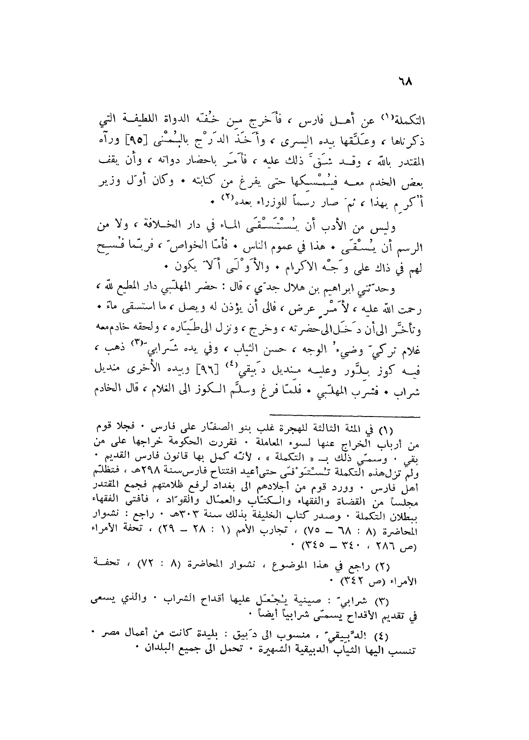 وحَدثني إِبْرَاهِيم بن هِلَال جدي قَالَ: حضر المهلبي دَار الْمُطِيع لله رحمت الله عَلَيْهِ لأمر عرض فَإلَى ان يُؤذن لَهُ ويصل مَا استسقى مَاء وَتَأَخر إِلَى ان دخل إِلَى حَضرته وَخرج وَنزل إِلَى طياره ولحقه خَادِم مَعَه غُلَام تركي وضيء الْوَجْه حسن الثِّيَاب وَفِي يَده شرابي ذهب فِيهِ كوز بلور وَعَلِيهِ منديل دبيقي وَبِيَدِهِ الْأُخْرَى منديل شراب فَشرب المهلبي فَلَمَّا فرغ وَسلم الْكوز إِلَى الْغُلَام قَالَ الْخَادِم