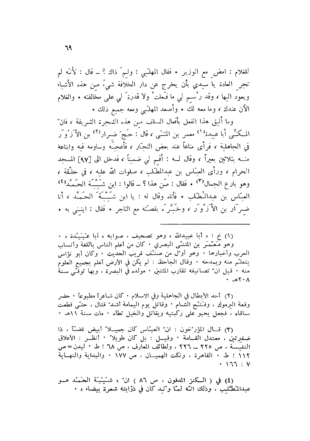 وَمَا أليق هَذَا الْفِعْل بِأَفْعَال السّلف من هَذِه الشَّجَرَة الشَّرِيفَة فَإِن المكنى أَبَا عُبَيْدَة معمر بن الْمثنى قَالَ: حج ضرار بن الْأَزْوَر فِي الْجَاهِلِيَّة فَرَأى مَتَاعا عِنْد بعض التُّجَّار فأعجبه وساومه فِيهِ وابتاعه مِنْهُ بِثَلَاثِينَ بَعِيرًا وَقَالَ لَهُ: أقِم لي ضمينا فَدخل إِلَى الْمَسْجِد الْحَرَام وَرَأى الْعَبَّاس بن عبد الْمطلب صلوَات الله عَلَيْهِ فِي حلقه وَهُوَ بارع الْجمال فَقَالَ: من هَذَا قَالُوا: ابْن شيبَة الْحَمد الْعَبَّاس بن عبد الْمطلب فَأَتَاهُ وَقَالَ لَهُ: يَا ابْن شيبَة الْحَمد انا ضرار بن الإزور وَخَبره بِقِصَّتِهِ مَعَ التَّاجِر فَقَالَ: ايتني بِهِ