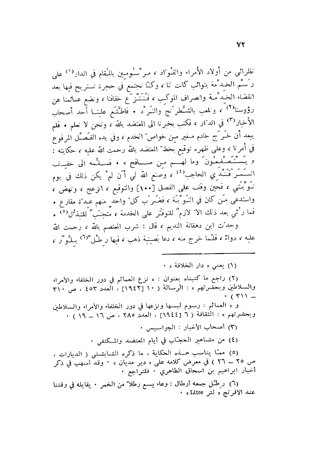 نظرائي من أَوْلَاد الْأُمَرَاء والقواد مرسومين بالْمقَام فِي الدَّار على رسم الْخدمَة بنوائب كَانَت لنا وَكُنَّا نَجْتَمِع فِي حجرَة نستريح فِيهَا بعد انْقِضَاء الْخدمَة وانصراف الموكب فننزع خفافنا وَنَضَع عمائمنا عَن رؤوسنا وَنَلْعَب بالشطرنج والنرد فَاطلع علينا أحد أَصْحَاب الْإِخْبَار فِي الدَّار فَكتب بخبرنا إِلَى المعتضد بِاللَّه وَنحن لَا نعلم فَلم يبعد ان خرج خَادِم صَغِير من خَواص الخدم وَفِي يَده الْفَصْل الْمَرْفُوع فِي أمرنَا وعَلى ظَهره توقيع بِخَط المعتضد بِاللَّه رحمت الله عَلَيْهِ حكايته: يستصفعون وَمَا لَهُم من صَافح فسلمه إِلَى خَفِيف السَّمرقَنْدِي الْحَاجِب وصنع الله لي ان لم يكن ذَلِك فِي يَوْم نوبتي فحين وقف على الْفَصْل والتوقيع انزعج ونهض واستدعى من كَانَ فِي النّوبَة فَضرب كل وَاحِد مِنْهُم عدَّة مقارع فَمَا رئي بعد ذَلِك إِلَّا لَازم للتوفر على الْخدمَة متجنب للتبذل