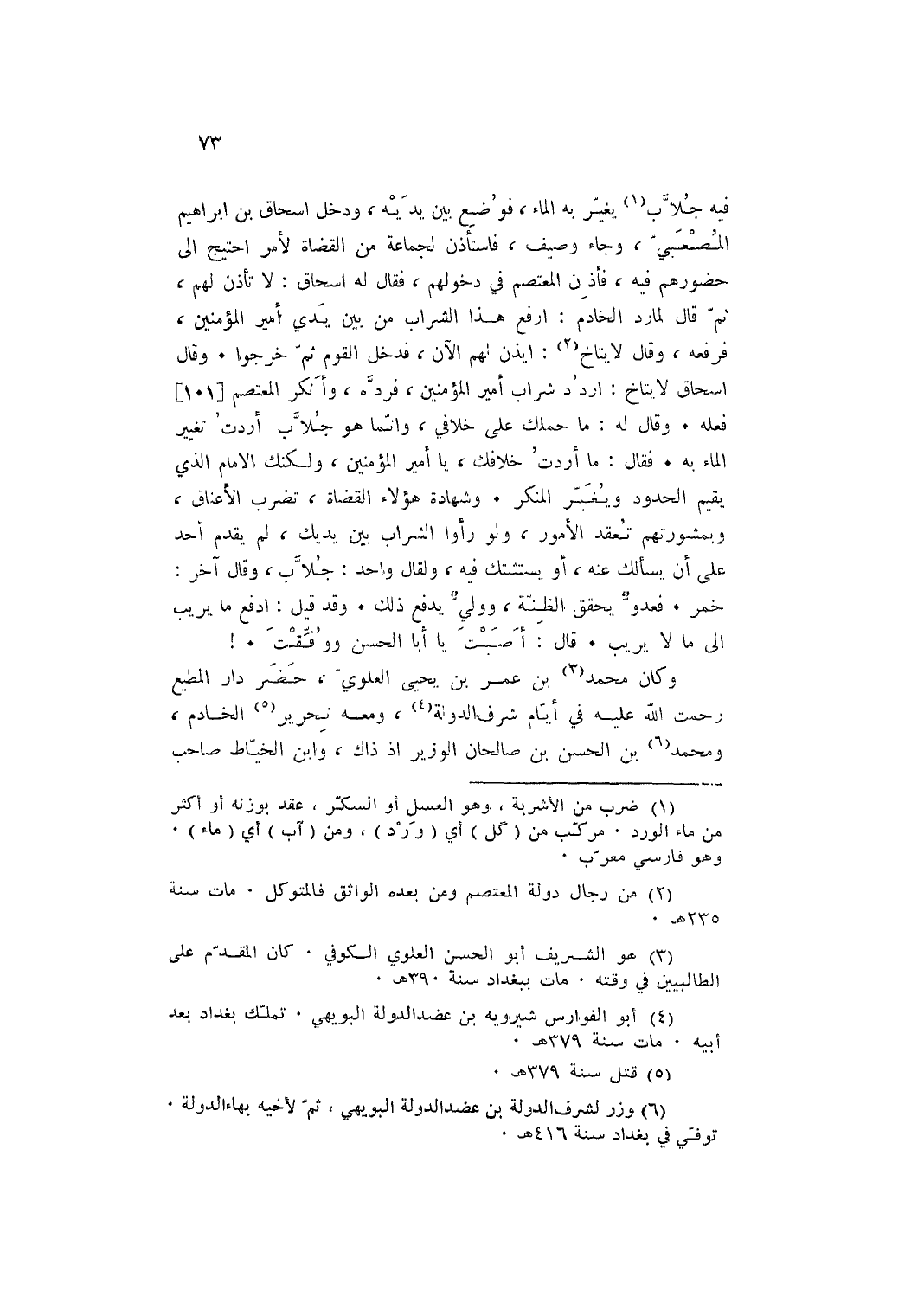 فِي جلاب يُغير بِهِ المَاء فَوضع بَين يَدَيْهِ وَدخل إِسْحَاق بن إِبْرَاهِيم المصعبي وَجَاء وصيف فَاسْتَأْذن لجَماعَة من الْقُضَاة لأمر احْتِيجَ إِلَى حضورهم فِيهِ فَأذن المعتصم فِي دُخُولهمْ فَقَالَ لَهُ إِسْحَاق: لَا تَأذن لَهُم ثمَّ قَالَ لمارد الْخَادِم: أرفع هَذَا الشَّرَاب من بَين يَدي أَمِير الْمُؤمنِينَ فرفعه وَقَالَ لايتاخ: ايذن لَهُم الْآن فَدخل الْقَوْم ثمَّ خَرجُوا وَقَالَ إِسْحَاق لَا يتاخ ارْدُدْ شراب أَمِير الْمُؤمنِينَ فَرده وَأنكر المعتصم فعله وَقَالَ لَهُ: مَا حملك على خلافي وَإِنَّمَا هُوَ جلاب أردْت تَغْيِير المَاء بِهِ فَقَالَ: مَا أردْت خِلافك يَا أَمِير الْمُؤمنِينَ وَلَكِنَّك الإِمَام الَّذِي يُقيم الْحُدُود ويغير الْمُنكر وَشَهَادَة هَؤُلَاءِ الْقُضَاة تضرب الْأَعْنَاق وبمشورتهم تعقد الْأُمُور وَلَو رَأَوْا الشَّرَاب بَين يَديك لم يقدم أحد على ان يَسْأَلك عَنهُ أَو يستشتك فِيهِ ولقال وَاحِد: جلاب وَقَالَ آخر: خمر فعدو يُحَقّق الظنة وَولي يدْفع ذَلِك وَقد قيل: ادْفَعْ مَا يريب إِلَى مَا لَا يريب قَالَ: أصبت يَا أَبَا الْحسن ووفقت