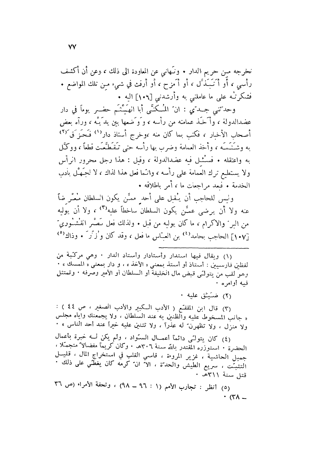 وحَدثني جدي: ان المكني أَبَا الْهَيْثَم حضر يَوْمًا فِي دَار عضد الدولة وَأخذ عمَامَته من رَأسه ووضعها بَين يَدَيْهِ وَرَآهُ بعض أَصْحَاب الْإِخْبَار فَكتب بِمَا كَانَ مِنْهُ وَخرج استاذ دَار فحزق بِهِ وَشَتمه وَأخذ الْعِمَامَة وَضرب بهَا رَأسه حَتَّى تقطعت قطعا ووكل بِهِ واعتقله فَسئلَ فِيهِ عضد الدولة وَقيل: هَذَا رجل محرور الرَّأْس وَلَا يَسْتَطِيع ترك الْعِمَامَة على رَأسه وانما فعل هَذَا لذاك لَا لجهل بأدب الْخدمَة فَبعد مراجعات مَا أَمر بِإِطْلَاقِهِ.