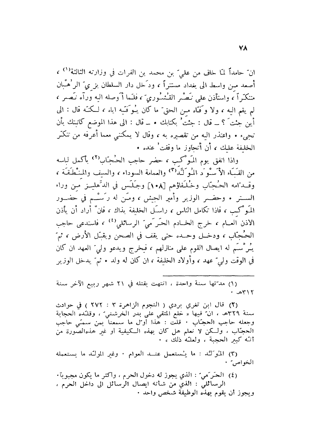 ان حامدا لما خَافَ من عَليّ بن مُحَمَّد بن الْفُرَات فِي وزارته الثَّالِثَة أصعد من وَاسِط إِلَى بَغْدَاد مستترا وَدخل دَار السُّلْطَان بزِي الرهبان متنكرا وَاسْتَأْذَنَ على نصر القشوري فَلَمَّا أوصله إِلَيْهِ وَرَآهُ نصر لم يقم إِلَيْهِ وَلَا وفاه من الْحق مَا كَانَ يُوفيه أَيَّاهُ، لكنه قَالَ: إِلَى أَيْن جِئْت قَالَ: جِئْت بكتابك قَالَ: إِلَى هَذَا الْموضع كاتبتك بِأَن تَجِيء وَاعْتذر إِلَيْهِ من تَقْصِيره بِهِ، وَقَالَ لَا يمكنني مَعَ مَا أعرفهُ من تنكر الْخَلِيفَة عَلَيْك ان أتجاوز مَا وقفت عِنْده.