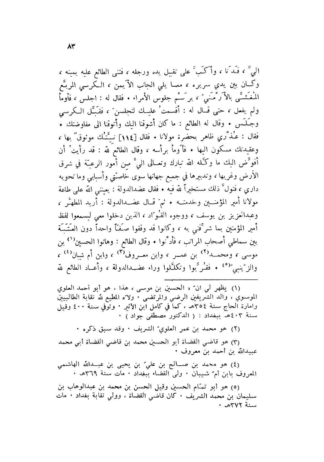 إِلَيّ فَدَنَا وأكب على تَقْبِيل يَده وَرجله فَثنى الطائع عَلَيْهِ يَمِينه وَكَانَ بَين يَدي سَرِيره مِمَّا يَلِي الْجَانِب الْأَيْمن الْكُرْسِيّ المربع المغشى بالأرمني برسم جُلُوس الْأُمَرَاء فَقَالَ لَهُ: أَجْلِس فَأَوْمأ وَلم يفعل حَتَّى قَالَ لَهُ: أَقْسَمت عَلَيْك لتجلسن فَقبل الْكُرْسِيّ وَجلسَ وَقَالَ لَهُ الطائع: مَا كَانَ أشوقنا إِلَيْك وأتوقنا إِلَى مفاوضتك فَقَالَ: عُذْري ظَاهر بِحَضْرَة مَوْلَانَا فَقَالَ نيتك موثوق بهَا وعقيدتك مسكون إِلَيْهَا فأموأ بِرَأْسِهِ وَقَالَ الطائع لله: قد رَأَيْت ان أفوض إِلَيْك مَا وَكله الله تبَارك وَتَعَالَى إِلَيّ من أُمُور الرّعية فِي شَرق الأَرْض وغربها وتدبيرها فِي جَمِيع جهاتها سوى خاصتي واسبابي وَمَا تحويه دَاري فتول ذَلِك مستخيرا لله فِيهِ فَقَالَ عضد الدولة: يُعِيننِي الله على طَاعَة مَوْلَانَا أَمِير الْمُؤمنِينَ وخدمته ثمَّ قَالَ عضد الدولة: أُرِيد المطهر وَعبد الْعَزِيز بن يُوسُف ووجوه القواد الَّذين دخلُوا معي ليسمعوا لفظ أَمِير الْمُؤمنِينَ بِمَا شرفني بِهِ وَكَانُوا قد وقفُوا صفا وَاحِدًا دون العتبة بَين سماطي أَصْحَاب الْمَرَاتِب فأدنوا وَقَالَ الطائع: وهاتوا الْحُسَيْن بن مُوسَى وَمُحَمّد بن عمر وَابْن مَعْرُوف وَابْن أم شَيبَان والزينبي فقربوا وتكللوا وَرَاء عضد الدولة وَأعَاد الطائع لله
