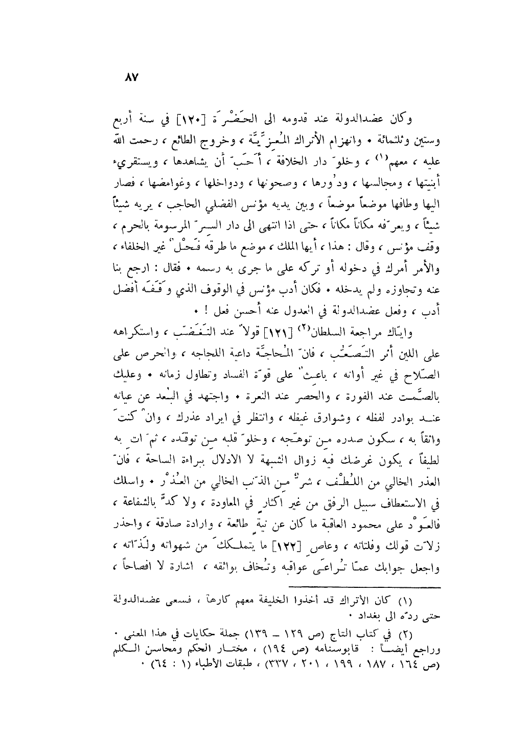 وَكَانَ عضد الدولة عِنْد قدومه إِلَى الحضرة فِي سنة أَربع وَسِتِّينَ وثلثمائة وانهزام الأتراك المعزية وَخُرُوج الطائع رحمت الله عَلَيْهِ مَعَهم وخلو دَار الْخلَافَة أحب ان يشاهدها ويستقرئ أبنيتها ومجالسها ودورها وصحونها ودواخلها وغوامضها فَصَارَ إِلَيْهَا وطافها موضعا موضعا وَبَين يَدَيْهِ مؤنس الفضلي الْحَاجِب يرِيه شَيْئا شَيْئا ويعرفه مَكَانا مَكَانا حَتَّى إِذا انتهي إِلَى دَار السِّرّ المرسومة بِالْحرم وقف مؤنس وَقَالَ هَذَا أَيهَا الْملك مَوضِع مَا طرقه فَحل غير الْخُلَفَاء وَالْأَمر أَمرك فِي دُخُوله أَو تَركه على مَا جرى بِهِ رسمه فَقَالَ: ارْجع بِنَا عَنهُ وتجاوزه وَلم يدْخلهُ فَكَانَ أدب مؤنس فِي الْوُقُوف الَّذِي وَقفه أفضل أدب وَفعل عضد الدولة فِي الْعُدُول عَنهُ أحسن فعل.