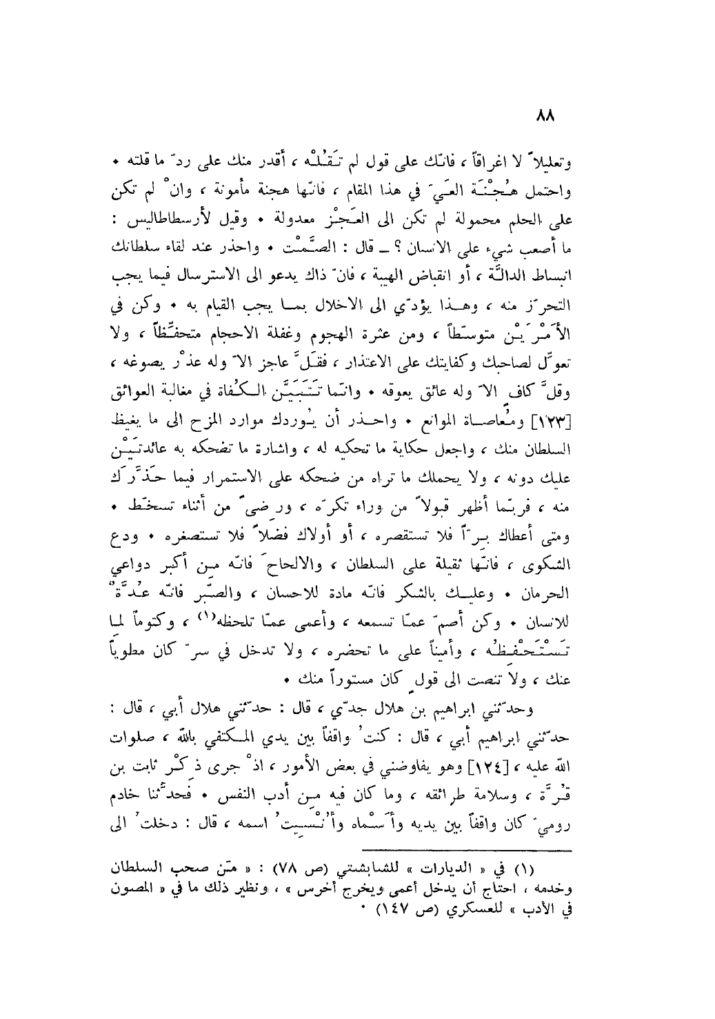 وتعليلا لَا إغراقا فَإنَّك على قَول لم تقله أقدر مِنْك على رد مَا قلته وَاحْتمل هجنة العي فِي هَذَا الْمقَام فانها هجنة مَأْمُونَة وان لم تكن على الْحلم مَحْمُولَة لم تكن إِلَى الْعَجز معدولة وَقيل لأرسطاطاليس: مَا أصعب شَيْء على الانسان قَالَ: الصمت وَاحْذَرْ عِنْد لِقَاء سلطانك انبساط الدَّالَّة أَو انقباض الهيبة فَإِن ذَاك يَدْعُو إِلَى الاسترسال فِيمَا يجب التَّحَرُّز مِنْهُ وَهَذَا يُؤَدِّي إِلَى الْإِخْلَال بِمَا يجب الْقيام بِهِ وَكن فِي الْأَمريْنِ متوسطا وَمن عَثْرَة الهجوم وغفلة الإحجام متحفظا وَلَا تعول لصاحبك وكفايتك على الِاعْتِذَار فَقل عَاجز إِلَّا وَله عذر يصوغه وَقل كَاف إِلَّا وَله عائق يعوقه وَإِنَّمَا تتبين الكفاة فِي مغالبة الْعَوَائِق ومعاصاة الْمَوَانِع وَاحْذَرْ ان يوردك موارد المزح إِلَى مَا يغِيظ السُّلْطَان مِنْك وَاجعَل حِكَايَة مَا تحكيه لَهُ وَإِشَارَة مَا تضحكه بِهِ عائدتين عَلَيْك دونه وَلَا يحملك مَا ترَاهُ من ضحكة على الإستمرار فِيمَا حذرك مِنْهُ فَرُبمَا أظهر قبولا من وَرَاء تكره ورضى من أثْنَاء تسخط