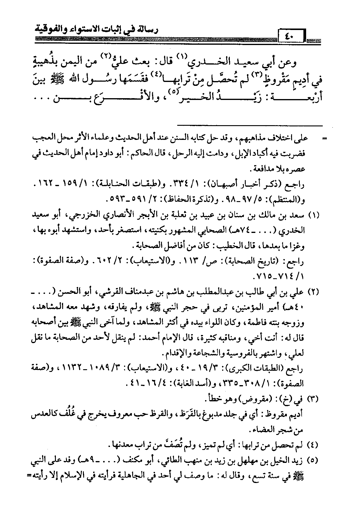 وَعَن أبي سعيد الْخُدْرِيّ قَالَ بعث عَليّ من الْيمن بذهيبة فِي أَدِيم مقروظ لم تحصل من ترابها فَقَسمهَا رَسُول الله صلى الله عَلَيْهِ وَسلم بَين أَرْبَعَة زيد الْخَيْر والأقرع بن
