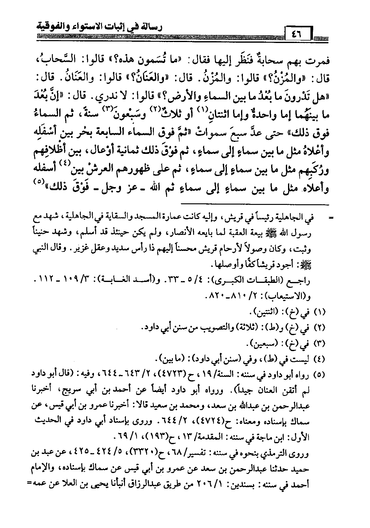 فمرت بهم سَحَابَة فَنظر إِلَيْهَا فَقَالَ (مَا تسمون هَذِه) قَالُوا السَّحَاب قَالَ (والمزن) قَالُوا والمزن قَالَ (والعنان) قَالُوا والعنان قَالَ (هَل تَدْرُونَ مَا بعد مَا بَين السَّمَاء وَالْأَرْض) قَالُوا لَا نَدْرِي قَالَ (إِن بعد مَا بَينهمَا إِمَّا وَاحِدَة وَإِمَّا اثْنَتَانِ أَو ثَلَاث وَسَبْعُونَ سنة ثمَّ السَّمَاء فَوق ذَلِك) حَتَّى عد سبع سموات (ثمَّ فَوق السَّمَاء السَّابِعَة بَحر بَين أَسْفَله وَأَعلاهُ مثل مَا بَين سَمَاء إِلَى سَمَاء ثمَّ فَوق ذَلِك ثَمَانِيَة أوعال بَين أظلافهم وركبهم مثل مَا بَين سَمَاء إِلَى سَمَاء ثمَّ على ظُهُورهمْ الْعَرْش بَين أَسْفَله وَأَعلاهُ مثل مَا بَين سَمَاء إِلَى سَمَاء ثمَّ الله عز وَجل فَوق ذَلِك