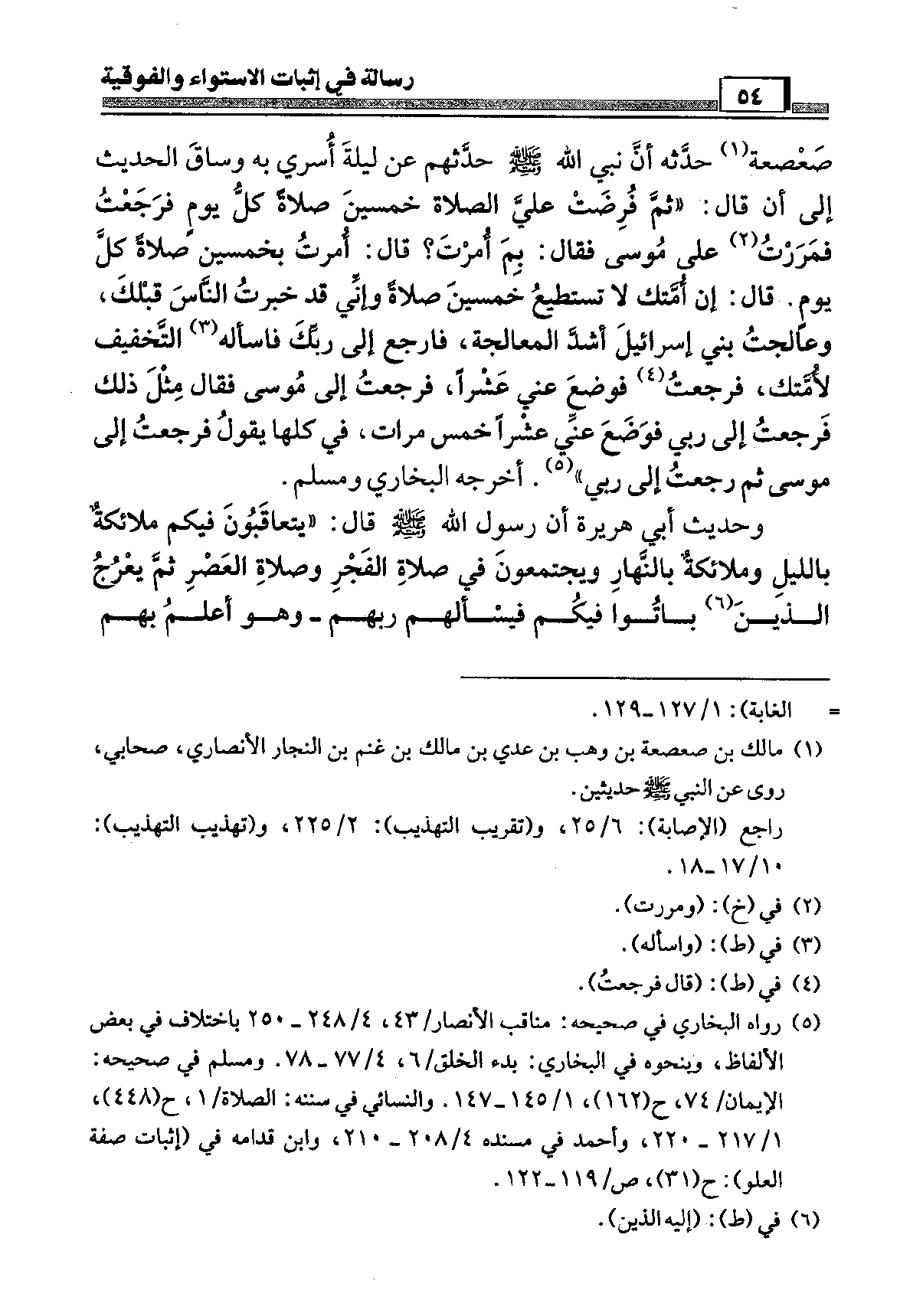 صعصعة حَدثهُ أَن نَبِي الله صلى الله عَلَيْهِ وَسلم حَدثهمْ عَن لَيْلَة أسرِي بِهِ وسَاق الحَدِيث إِلَى أَن قَالَ (ثمَّ فرضت عَليّ الصَّلَاة خمسين صَلَاة كل يَوْم فَرَجَعت فمررت على مُوسَى فَقَالَ بِمَ أمرت قَالَ أمرت بِخَمْسِينَ صَلَاة كل يَوْم قَالَ إِن أمتك لَا تَسْتَطِيع خمسين صَلَاة وَإِنِّي قد خبرت النَّاس قبلك وعالجت بني إِسْرَائِيل أَشد المعالجة فَارْجِع إِلَى رَبك فَاسْأَلْهُ التَّخْفِيف لأمتك فَرَجَعت فَوضع عني عشرا فَرَجَعت إِلَى مُوسَى فَقَالَ مثل ذَلِك فَرَجَعت إِلَى رَبِّي فَوضع عني عشرا خمس مَرَّات فِي كلهَا يَقُول فَرَجَعت إِلَى مُوسَى ثمَّ رجعت إِلَى رَبِّي)