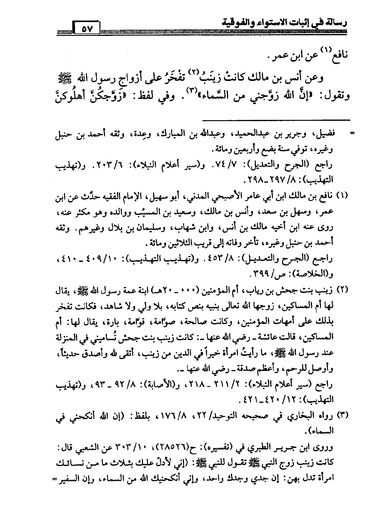 وَعَن أنس بن مَالك كَانَت زَيْنَب تَفْخَر على أَزوَاج رَسُول الله صلى الله عَلَيْهِ وَسلم وَتقول إِن الله زَوجنِي من السَّمَاء) وَفِي لفظ (زوجكن أهلوكن