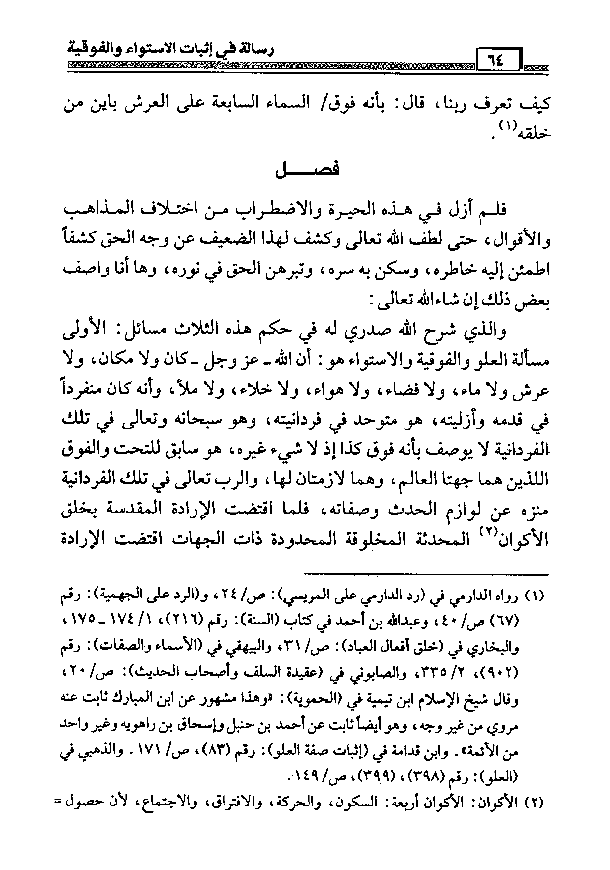 وَالَّذِي شرح الله صَدْرِي لَهُ فِي حكم هَذِه الثَّلَاث مسَائِل الأولى مَسْأَلَة الْعُلُوّ والفوقية والاستواء هُوَ أَن الله عز وَجل كَانَ وَلَا مَكَان لوا عرش وَلَا مَاء وَلَا فضاء وَلَا هَوَاء وَلَا خلاء وَلَا مَلأ وَأَنه كَانَ مُنْفَردا فِي قدمه وأزليته هُوَ متوحد فِي فردانيته وَهُوَ سُبْحَانَهُ وَتَعَالَى فِي تِلْكَ الفردانية لَا يُوصف بِأَنَّهُ فَوق كَذَا إِذْ لَا شَيْء غَيره هُوَ سَابق للتحت والفوق اللَّذين هما جهتا الْعَالم وهما لازمتان لَهَا والرب تَعَالَى فِي تِلْكَ الفردانية منزه عَن لَوَازِم الْحَدث وَصِفَاته فَلَمَّا اقْتَضَت الْإِرَادَة المقدسة بِخلق الأكوان المحدثة المخلوقة المحدودة ذَات الْجِهَات اقْتَضَت الْإِرَادَة