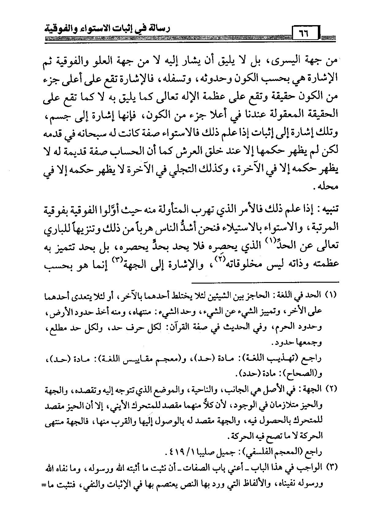 تَنْبِيه إِذا علم ذَلِك فَالْأَمْر الَّذِي تهرب المتأولة مِنْهُ حَيْثُ أولُوا الْفَوْقِيَّة بفوقية الْمرتبَة والاستواء بِالِاسْتِيلَاءِ فَنحْن أَشد النَّاس هربا من ذَلِك وتنزيها للباري تَعَالَى عَن الْحَد الَّذِي يحصره فَلَا يجد بِحَدّ يحصره بل يحد تتَمَيَّز بِهِ عَظمته وذاته لَيْسَ مخلوقاته وَالْإِشَارَة إِلَى الْجِهَة إِنَّمَا هُوَ بِحَسب