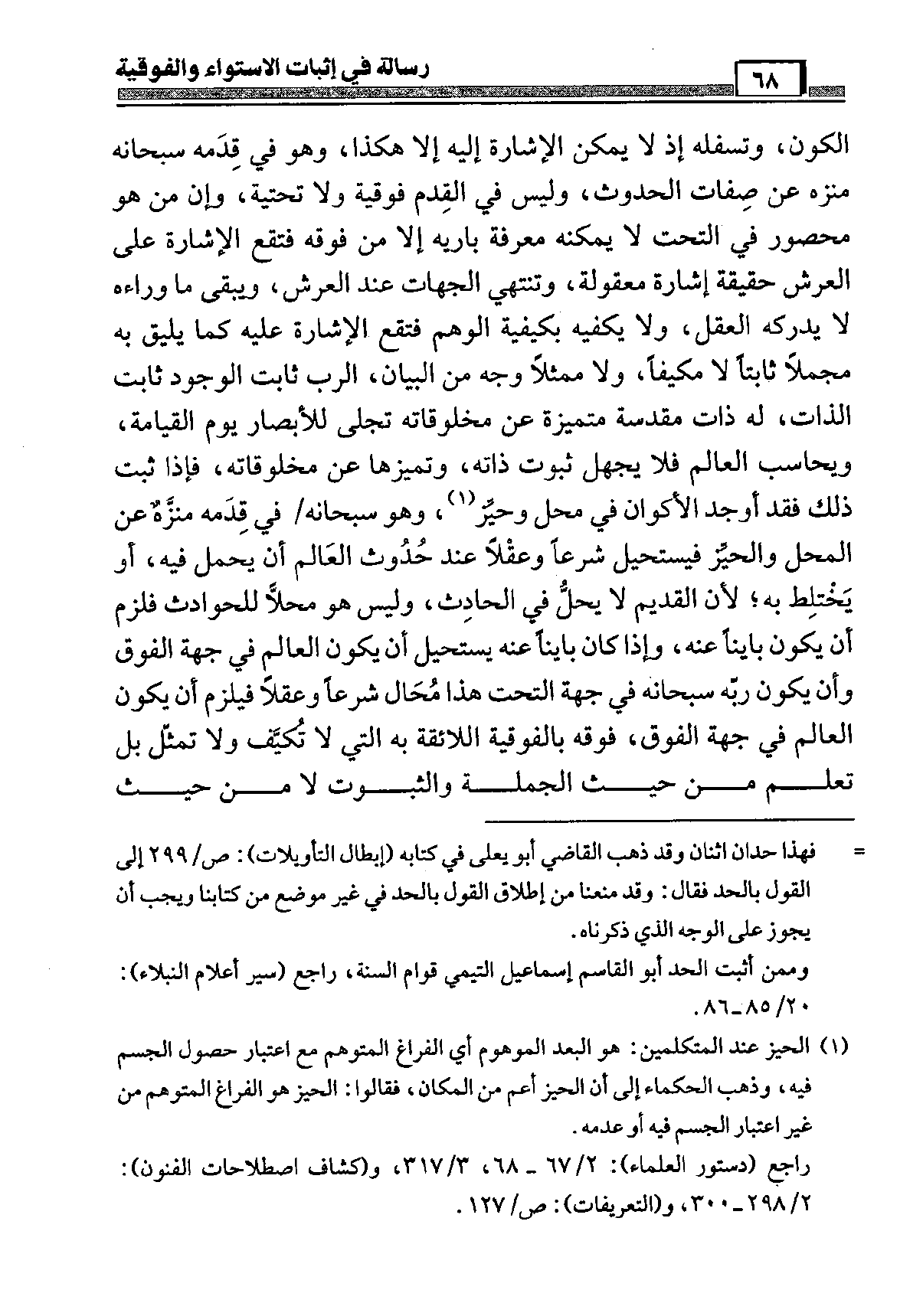 الْكَوْن وتسفله إِذْ لَا يُمكن الْإِشَارَة إِلَيْهِ إِلَّا هَكَذَا وَهُوَ فِي قدمه سُبْحَانَهُ منزه عَن صِفَات الْحُدُوث وَلَيْسَ فِي الْقدَم فوقية وَلَا تحتية وَإِن من هُوَ مَحْصُور فِي التحت لَا يُمكنهُ معرفَة باريه إِلَّا من فَوْقه فَتَقَع الْإِشَارَة على الْعَرْش حَقِيقَة إِشَارَة معقولة وتنتهي الْجِهَات عِنْد الْعَرْش وَيبقى مَا وَرَاءه لَا يُدْرِكهُ الْعقل وَلَا يَكْفِيهِ بكيفية الْوَهم فَتَقَع الْإِشَارَة عَلَيْهِ كَمَا يَلِيق بِهِ مُجملا ثَابتا لَا مكيفا وَلَا ممثلا وَجه من الْبَيَان الرب ثَابت الْوُجُود ثَابت الذَّات لَهُ ذَات مُقَدَّسَة متميزة عَن مخلوقاته تجلى للأبصار يَوْم الْقِيَامَة وَيُحَاسب الْعَالم فَلَا يجهل ثُبُوت ذَاته وتميزها عَن مخلوقاته فَإِذا ثَبت ذَلِك فقد أوجد الأكوان فِي مَحل وحيز وَهُوَ سُبْحَانَهُ فِي قدمه منزه عَن الْمحل والحيز فيستحيل شرعا وعقلا عِنْد حُدُوث الْعَالم أَن يحمل فِيهِ أَو يخْتَلط بِهِ لِأَن الْقَدِيم لَا يحل فِي الْحَادِث وَلَيْسَ هُوَ محلا للحوادث فَلَزِمَ أَن يكون باينا عَنهُ وَإِذا كَانَ باينا عَنهُ يَسْتَحِيل أَن يكون الْعَالم فِي جِهَة الفوق وَأَن يكون ربه سُبْحَانَهُ فِي جِهَة التحت هَذَا محَال شرعا وعقلا فَيلْزم أَن يكون الْعَالم فِي جِهَة الفوق فَوْقه بالفوقية اللائقة بِهِ الَّتِي لَا تكيف وَلَا تمثل بل تعلم من حَيْثُ الْجُمْلَة والثبوت لَا من حَيْثُ